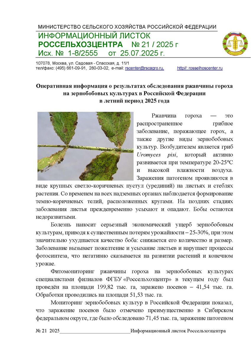 Оперативная информация о результатах обследования ржавчины горохана зернобобовых культурах в Российской Федерациив летний период 2025 года