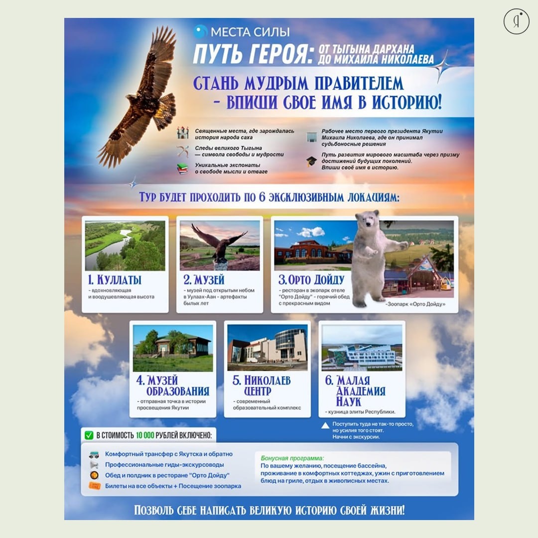 Путь героя: от Тыгына до Михаила Николаева #ЗаГородом Пройди эпическое путешествие по следам легендарных правителей, определивших судьбу целого народа! Это не просто экскурсия — это погружение в глубины истории, где каждый камень хранит память о великих событиях, а каждый экспонат рассказывает о становлении якутской государственности В программе: 🤩 Погружение в сакральное пространство Куллаты: взгляд в грядущее сквозь призму прошлого; 🤩 Вдохновляющая история жизни Тыгын Дархана, Мунньан Дархана - легендарных правителей Якутии; 🤩 Знакомство с Мазары Бозековым — история первого якута дошедшего в 17 веке до Москвы к царю и сумевшему получить его покровительство; 🤩 Рассказ о выдающемся деятеле Софроне Сыранове, ставшем депутатом Сената еще при Екатерине II; 🤩 Уникальная экспозиция о жизни и деятельности Михаила Николаева, первого президента Якутии; 🤩 Путешествие в мир открытий: образовательный тур для будущих лидеров Республики; 🤩 Флора и фауна Якутии в самом северном Зоопарке.