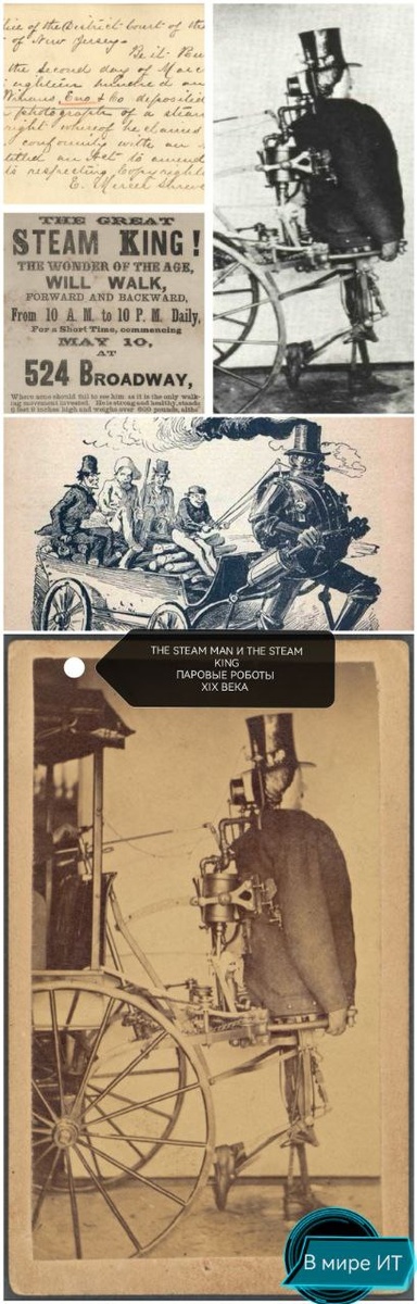 ПАРОВЫЕ РОБОТЫ XIX ВЕКА THE STEAM MAN И THE STEAM KING |🚶♂️⚙️ В XIX веке в Америке и Европе инженеры создали механических «ходячих» роботов - The Steam Man и The Steam King. Паровые машины оснащались паровыми двигателями и полуавтоматически двигали ногами, имитируя человеческую походку. Самый известный — The Steam Man, создан Задоком Дедериком в 1868 году. Он был гигантом: рост 7 футов 9 дюймов (около 2,4 м), вес 500 фунтов (около 227 кг), обхват талии 200 дюймов. Ноги представляли собой сложный механизм из железных кривошипов, винтов и пружин. Паровой двигатель мощностью около 4 лошадиных сил приводил робота в движение, а шаг длиной в 30 дюймов позволял ему уверенно идти, преодолевая препятствия до 30 см. Машины могли тянуть повозки и перевозить людей - например, за рулём мог сидеть водитель, управлявший Steam Man с помощью рычагов. Вдохновляли проект известные личности, Улисс Грант и принц Уэльский (король Эдуард). The Steam Man - яркий образ паровых технологий на заре робототехни