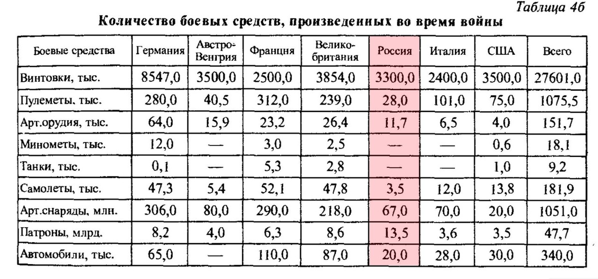 - Российская промышленность многократно уступила германской в производстве вооружений (смотрим таблицу из уже упоминавшегося труда под редакцией генерал-полковника Г. Ф. Кривошеева).