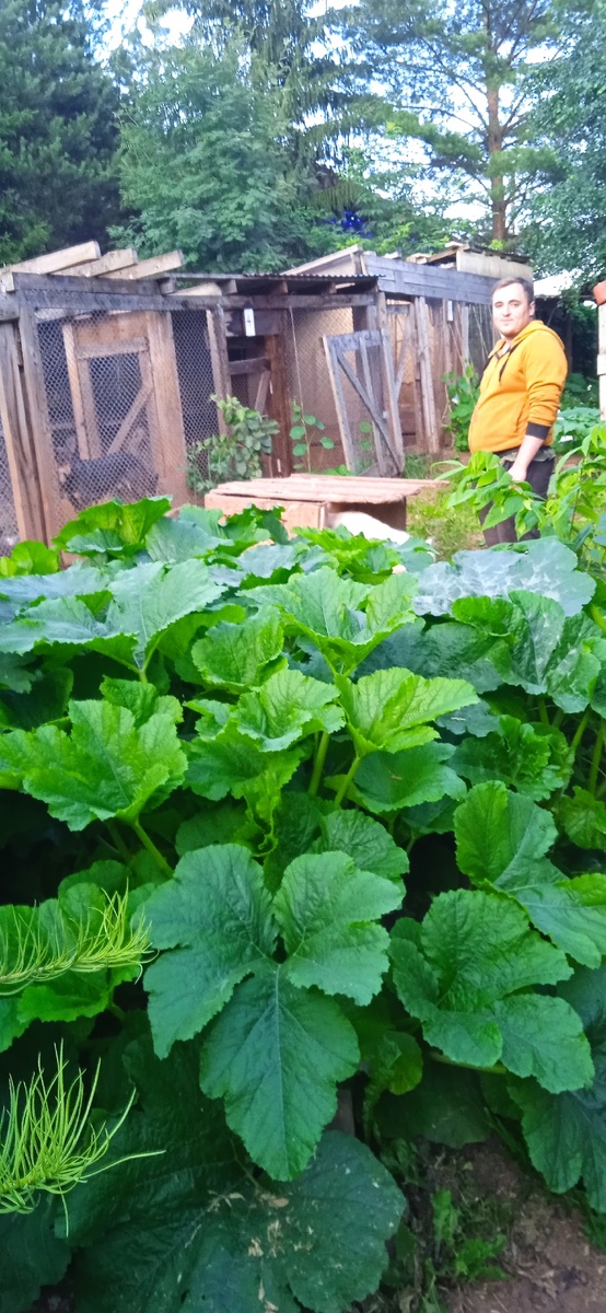 На фото наши кабачки (с ними будет вкуснее, питательней и экономичней, но пока только еще начинают расти), тыквы еще совсем малы.
