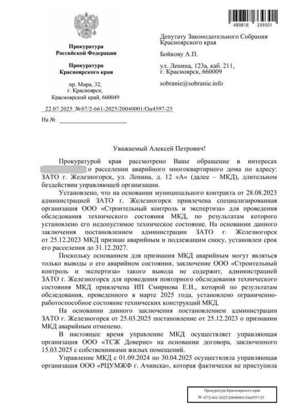 Депутат Заксобрания края Алексей Бойков рассказал, что после его официального обращения прокуратура провела проверку в отношении управляющей