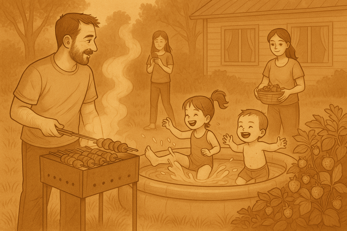 Сегодняшний день прошёл как по учебнику «Как выглядят счастливые семьи, том I». Разожгли мангал — не без танцев с шампурами и фраз «да кто вообще придумал уголь!» Старшая дочка принесла со двора старую колонку, подключила Bluetooth, включила какой-то ненавязчивый хип-хоп — я бурчал, но потом поймал себя на том, что подпинываю в такт угли. Мелкие носились по двору в купальниках, прыгали в надувной бассейн, брызгались, визжали. Я пару раз присел на край, потом уже и сам плюхнулся — под смех жены и под её «Андрюш, ты с ума сошёл, вода же холодная!» А потом, когда шашлык чуть остыл, я взял ведёрко и пошёл с младшими на клубничную грядку. Собирали как могли: половина ушла сразу в рот, у сына всё лицо стало в красных пятнах, дочка пыталась «деликатно» — срывала по одной, клала в ладошку, гордо показывала маме. На закуску — горох из соседней грядки. Сладкий, сочный, как в детстве на бабушкином огороде. Сижу сейчас на веранде, ноги мокрые, дети уснули в обнимку, жена заваривает чай, на столе о