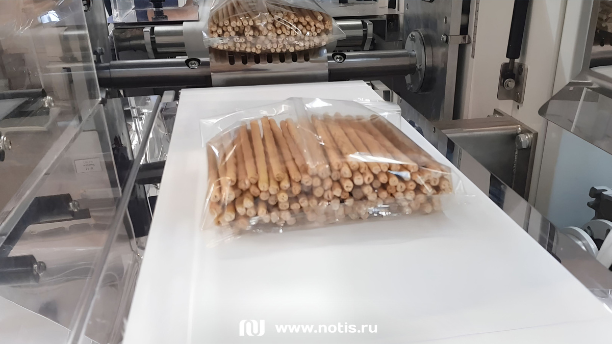 А помните длинную соломку, которая была популярна в нашем детстве? К сожалению, ее производство почти сошло на нет из-за сложностей с упаковкой. Текущее популярное решение фасовки соломки — дозирование на мультиголовочном (комбинационном) дозаторе. При этом палочки поднимают на 4-метровую высоту вертикальных упаковочных автоматов, где они затем совершают ступенчатые падения: сначала в ковши дозатора, потом вниз к упаковочному автомату, и наконец, падают в уже сформированный пакет. Такой метод не позволяет работать с длинным продуктом. Классическая длинная соломка на заходит в ковши мульти-головы. Сегодня мы хотим поделиться уникальным решением, разработанным российской компанией НОТИС из сибирского города Бердск. Речь идет об автоматической линии для упаковки хлебной соломки длиной от 13 до 33 см и весом от 150 до 450 г. Что делает эту разработку по-настоящему особенной? Наша разработка – это комплекс из одного или нескольких линейных дозаторов (в зависимости от нужной производительно