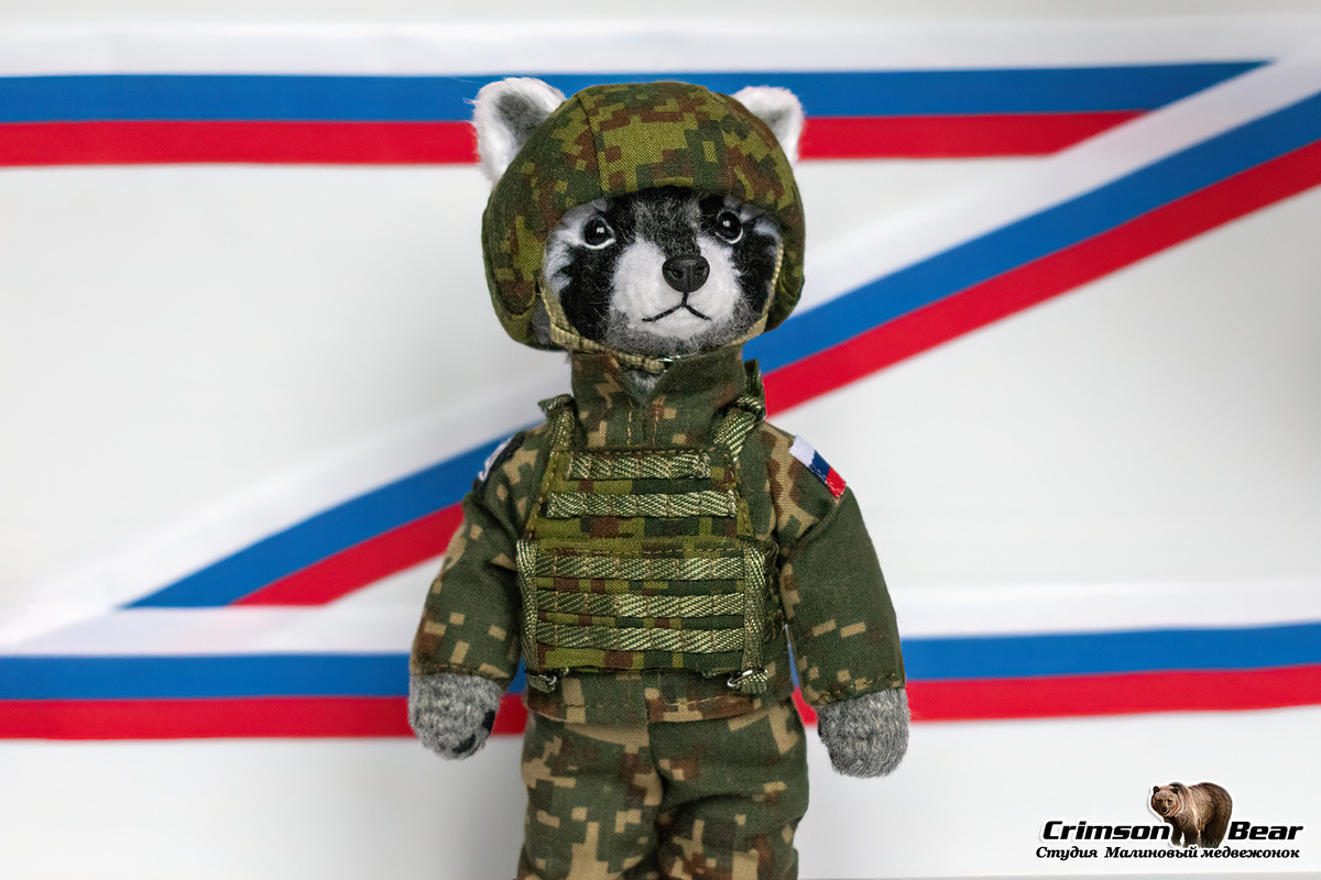 Размер енота 16 см. Связан из пушистой пряжи, в лапах и хвосте меднопроволочный каркас, голова на подвижном креплении. Нашивка "Z" и флаг РФ.