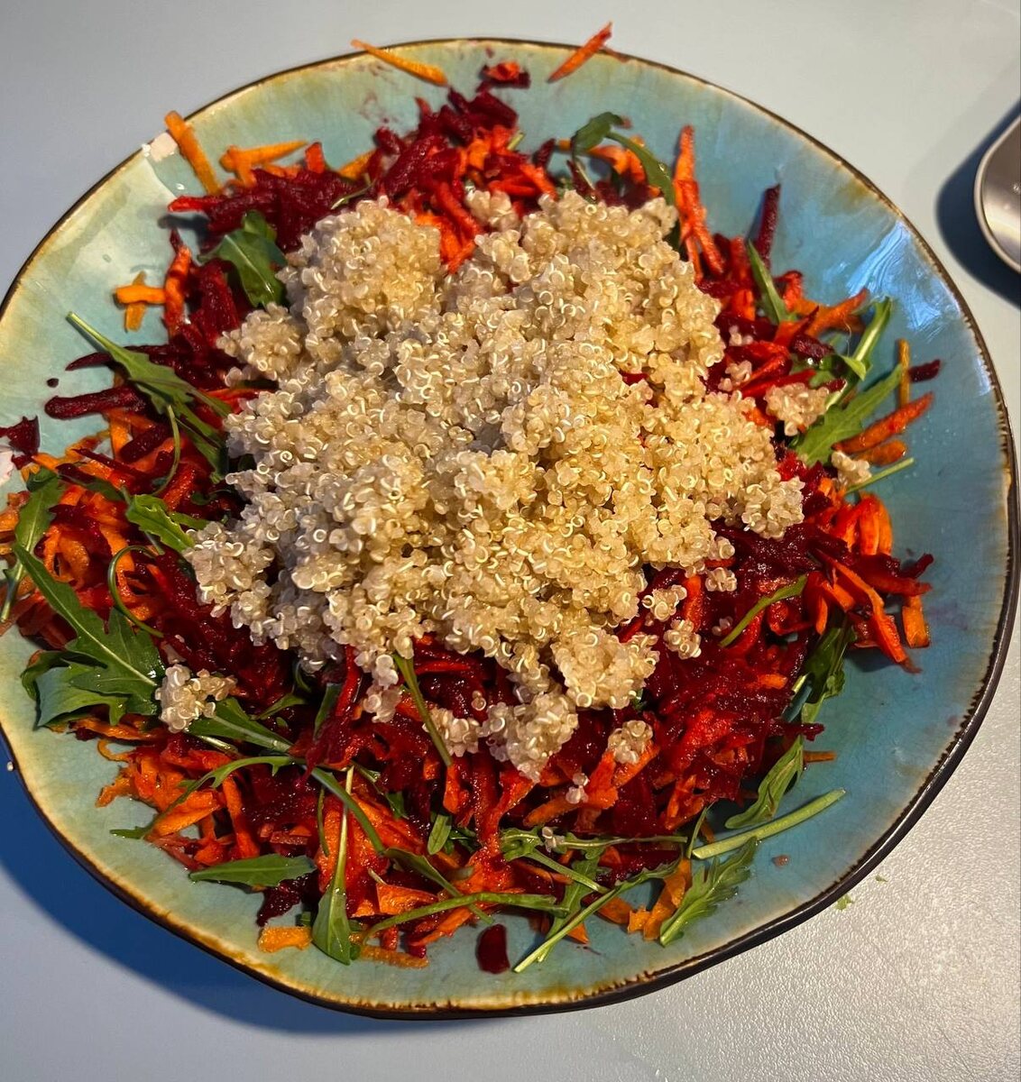 Объявляю неделю кайфовых здоровых рецептов для лета. Летом, в жару, когда калории нужны, но есть ничего не хочется...(в Сочи обещают очень жаркую неделю, а если у вас прохладно, то знайте эти рецепты из моего детокс-меню, когда сытно и легко!) 🟡Пучок рукколы 🟢Тертая морковь 🟡Тертая небольшая сырая свекла 🟢Полчашки отваренной киноа 🟡Сок лимона (лучше узбекский, который сладковатый) И да, ни соль, ни масло не нужны, хотя если хочется, то, конечно, можно добавить, соль — известный усилитель вкуса. РЕЦЕПТЫ для стройности, здоровья и вкуса к жизни - 5 минут и готово!