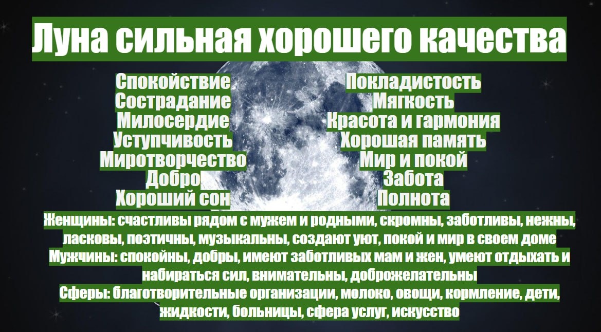 ЛУНА В БЛАГОСТИ (СИЛЬНАЯ, ХОРОШЕГО КАЧЕСТВА) 💧День недели - понедельник 💧Представитель в жизни - мама, беременные женщины, дети 💧Луна управляет Раком - женским знаком зодиака 💧В знаке Тельца Луна в экзальтации (максимальной силы) 💧Скорпион знак падения, ослабления (Марана-авастха) для Луны 💧4 дом лучший дом, Диг бала - дом направляющей силы 💧8 дом худший, 6, 12 неблагоприятны, 10 дом - дом нулевой Диг балы 💧Камень - жемчуг, лунный камень 💧Число 2 Приведу описание Луны из книги об астрологической совместимости супругов Олега Геннадьевича Торсунова. Луна связанна с женским началом, и потому характер этой планеты сильно выражен в теле и поведении женщин и в меньшей степени - мужчин. Луна дает женщинам красоту характера, способность приносить семейное счастье. Луна отвечает за взаимопонимание в семье, семейный уют, заботу, крепость семейных уз. Человек проявляет в своем поведении следующие качества: спокойствие, удовлетворение, сострадание, милосердие, деликатность, уступчивос
