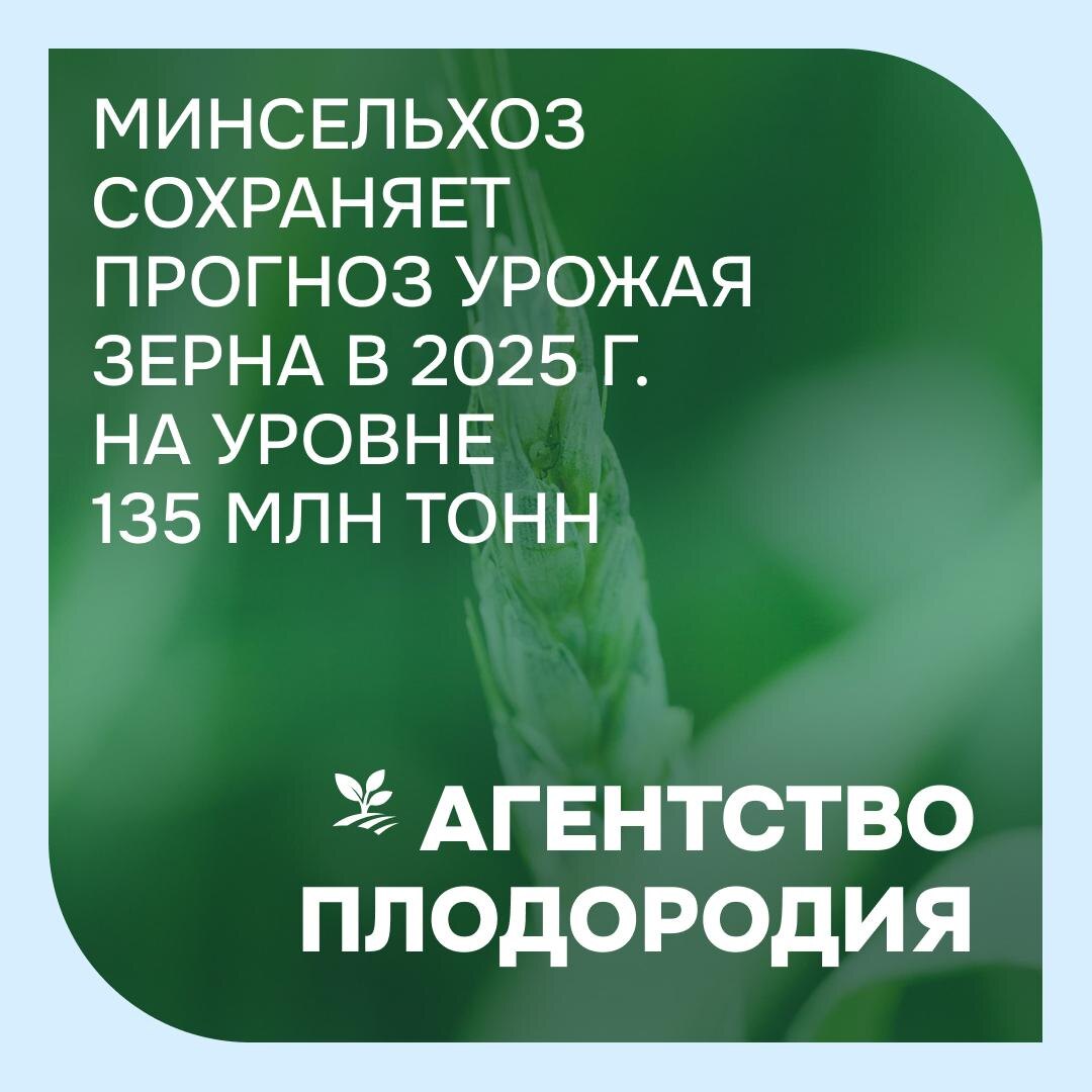 🌱 Минсельхоз сохранят прогноз урожая зерна в 2025 г. в 135 млн тонн 📈 Минсельхоз России сохранят прогноз по производству зерновых и зернобобовых культур на уровне 135 млн тонн в 2025 году при благоприятных погодных условиях в период уборки урожая. Об этом сообщила в пресс-службе Минсельхоза России. По итогам 2024 года урожай зерна в России составил почти 130 млн тонн. «В текущем году в отдельных регионах Юга страны, в частности, Ростовской области, Республике Крым и некоторых районах Краснодарского края сложились неблагоприятные условия для формирования урожая зерновых культур. Минсельхоз сохраняет прогноз по производству зерновых и зернобобовых культур на уровне 135 млн тонн при благоприятных погодных условиях в период уборки урожая», — говорится в сообщении министерства. По данным Минсельхоза, в большинстве регионов Центрального, Приволжского, Северо-Кавказского федеральных округов, а также в отдельных южных регионах (Адыгея, Волгоград) фактическая урожайность выше прошлогодних