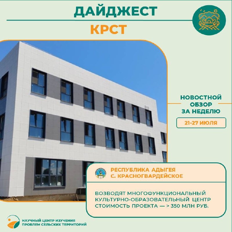Обзор новостей комплексного развития сельских территорий с 21 по 27 июля 📍Республика Адыгея В Красногвардейском возводят многофункциональный культурно-образовательный центр. На эти цели выделено более 350 млн рублей. 📍Республика Алтай В Шебалино капитально ремонтируют Центр культуры. Готовность объекта — почти 70%. Открыть центр планируют до 1 октября. 📍КБР В Псыхурее возводят ДК на 300 мест общей площадью более 1,4 тыс. кв. м. 📍Республика Хакасия В Белом Яре достраивают детсад на 120 мест. Общий объем инвестиций — 220 млн руб. 📍Архангельская область В Няндоме возводят ФОК площадью более 2 тыс.кв. м. Открытие запланировано в сентябре. Стоимость проекта — 212 млн руб. 📍Калининградская область В Гвардейске строят детсад на 240 мест. Стоимость объекта — более 630 млн руб. 📍Ленинградская область В Паше завершают капремонт детсада. Количество мест увеличится с 84 до 195. Открытие запланировано в августе. 📍Новосибирская область В Краснозерском строят СОК. Завершение строитель