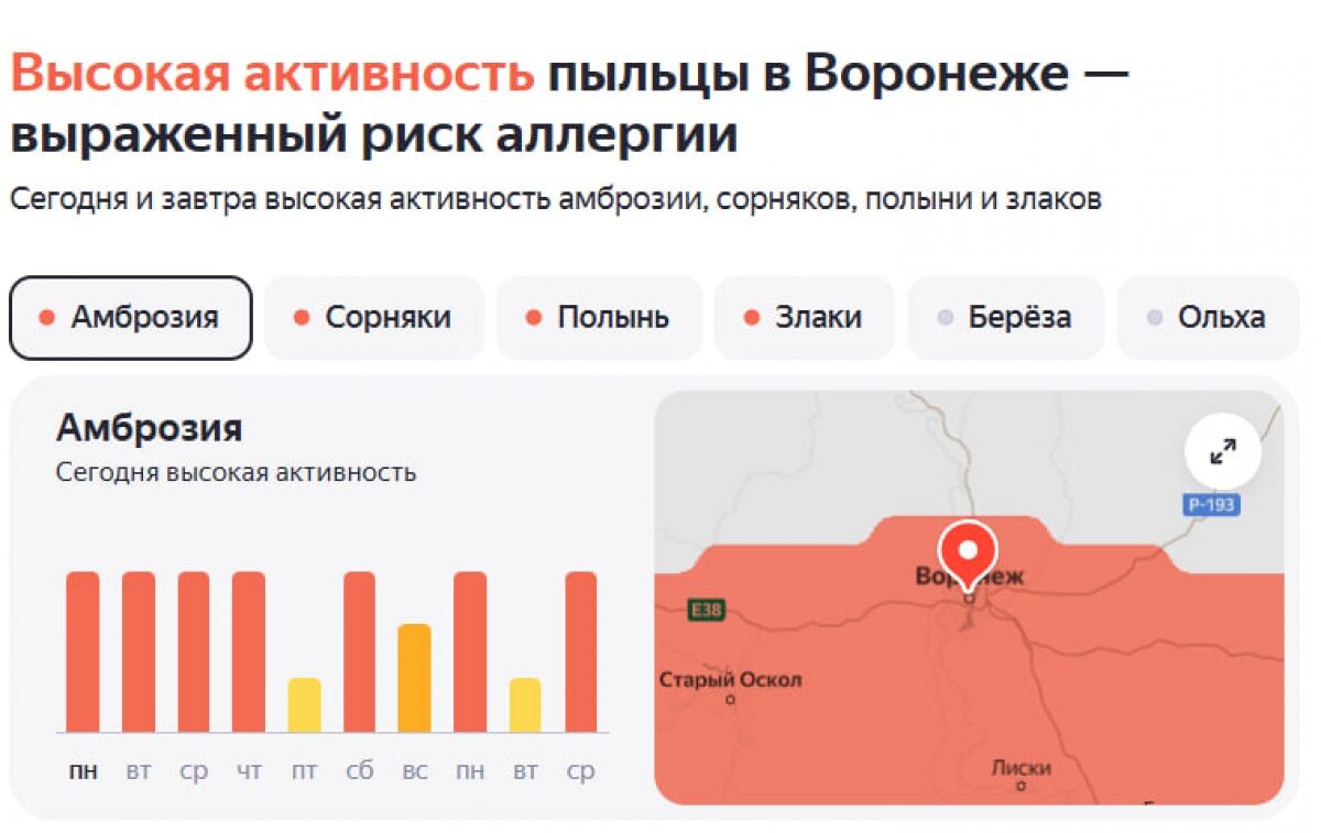 Воронежским аллергикам в ближайшие дни придется несладко из-за высокой активности пыльцы. Об этом свидетельствуют данные сервиса "Яндекс Погода". В Воронеже и южных районах области наблюдается высокая концентрация пыльцы амброзии. Такая ситуация сохранится до конца рабочей недели. А вот в пятницу активность немного уменьшится, но затем снова начнёт расти. Аналогичная ситуация наблюдается с пыльцой сорных растений, которая распространена по всей территории Воронежской области. Её концентрация уменьшится к концу рабочей недели. Также продолжается интенсивное цветение полыни и злаков в регионе. В пятницу активность пыльцы этих растений снизится, но в выходные дни снова начнёт расти. Напомним, ранее воронежцев также предупреждали о высокой активности пыльцы. Тогда также отмечалась высокая активность амброзии, сорняков, полыни и злаков.