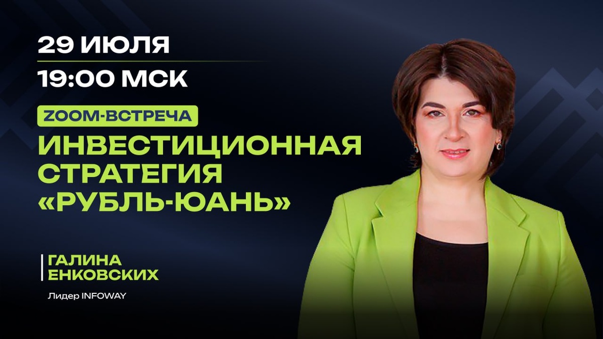 👨💼Инвестиционная стратегия «Рубль-Юань» Приглашаем вас на открытую презентацию стратегии, которая уже почти 20 лет демонстрирует устойчивую доходность на перекрёстке трендов рубля и китайского юаня! ✅Детальный разбор алгоритма ✅Анализ юридической структуры ✅Природа риска инвестиционной стратегии ✅Планирование кратного увеличения капитала вместе с IWM 📆Дата: 29 июля Время: 19:00 МСК Формат: онлайн-презентация в Zoom Спикер встречи: Галина Енковских ЛИДЕР INFOWAY! - Успешный предприниматель - Профессиональный инвестор на фондовом рынке - Более 10 лет опыта в финансовом консалтинге ✅Ссылка: https://us06web.zoom.us/j/2116731674?pwd=xahqmhZLmGsNMAcfVYG8sNdiNWlLRY.1