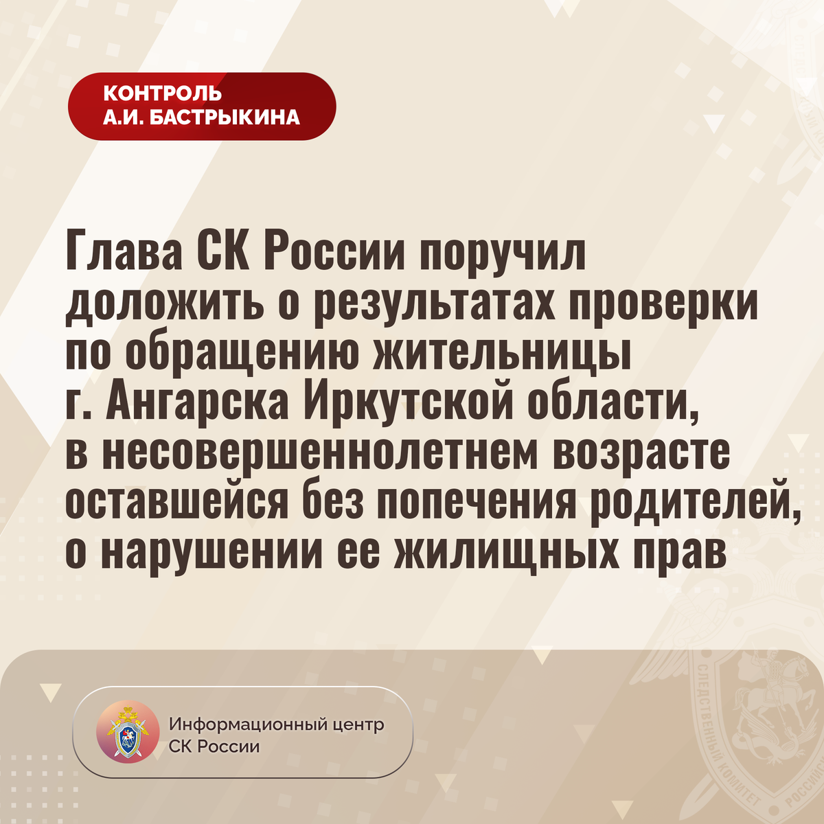 Глава СК России поручил доложить о результатах проверки по обращению жительницы г. Ангарска Иркутской области, в несовершеннолетнем возрасте оставшейся без попечения родителей, о нарушении ее жилищных прав В приёмную Председателя СК России А.И. Бастрыкина «ВКонтакте» обратилась жительница города Ангарска Иркутской области, в несовершеннолетнем возрасте оставшаяся без попечения родителей, по вопросу непредоставления ей положенного по закону жилья. С 2015 года девушка состоит на учете лиц, подлежащих обеспечению жилыми помещениями, однако до настоящего времени мер к реализации ее прав не принято. В связи с отсутствием собственной жилплощади заявительница, воспитывающая малолетнего ребенка, вынуждена арендовать квартиру за свой счет, что для нее финансово затруднительно. Многочисленные обращения в компетентные органы результатов не принесли. В СУ СК России по Иркутской области начата процессуальная проверка. Председатель Следственного комитета Российской Федерации Александр Иванович Бастр