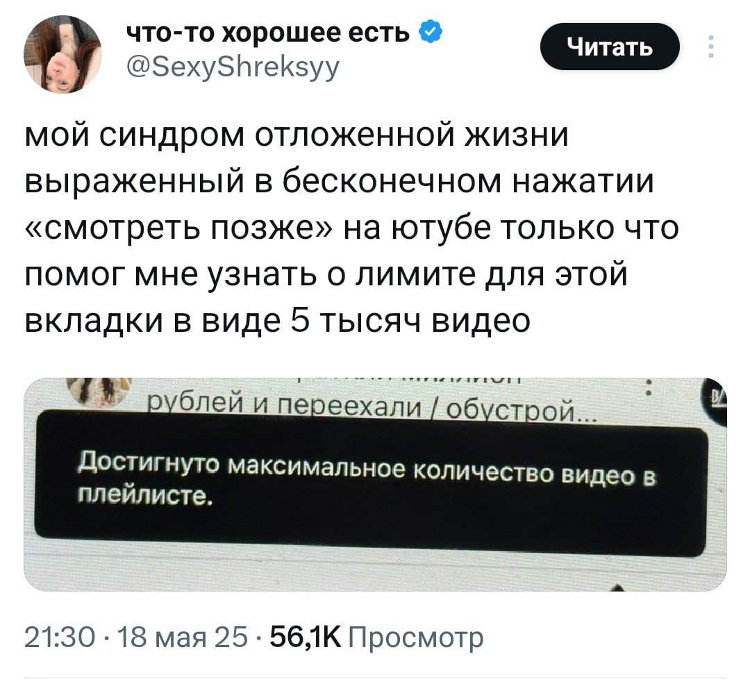 Твиттерская прошла Ютуб — он просто сломался, когда счетчик видосов в «Смотреть позже» достиг 5 тысяч