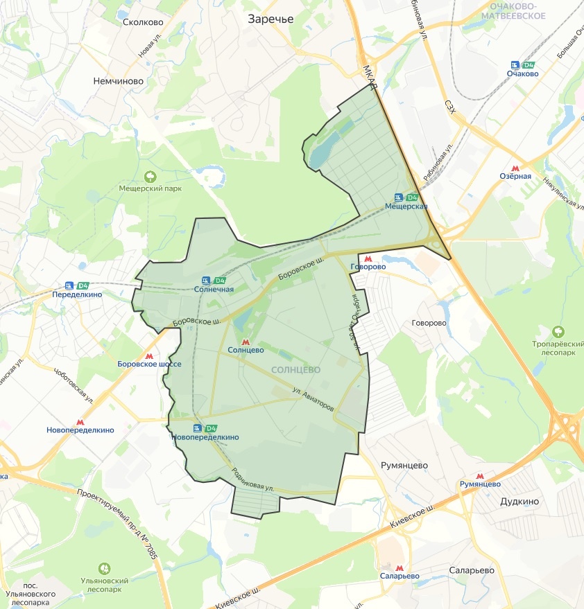 Друзья, добрый день, продолжаем московские районы за МКАД. Уже были Куркино, Молжаниновский, Бутово и Митино. Сегодня - Солнцево. Административный район, входящий в ЗАО и расположенный вдоль Боровского шоссе, к юго-западу от МКАД. Административные границы постоянно меняются и я не так и не понял, являются ли на данный момент Говорово и Румянцево официально частью Солнцево или нет. На мой взгляд, вся территория, ограниченная Киевским шоссе, Ульяновским и Мещерским лесопарками - единый сложившийся жилой массив, включающий административные районы ЗАО Солнцево и НовоПеределкино, а также Говорово и Румянцево. Внуково уже само по себе, как и Новая Москва по другою сторону Киевки, хотя и его можно рассматривать как часть этого жилого массива. Как-то так: Но не настаиваю, можно руководствоваться и административными границами. Самая главная устойчивая ассоциация с Солнцево долгое время была связана с "братвой" и "Солнцевским ОПГ", но это, вроде как, уже давно в прошлом. Из достопримечатель