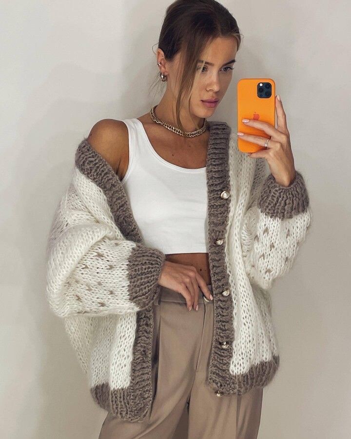 Это действительно классная идея! Кардиган выполнен в нежном белом или молочном цвете, а резинка на рукавах и по низу другого цвета. Сейчас в моде такие модели. Эта модель будет прекрасно смотреться в любом гардеробе.