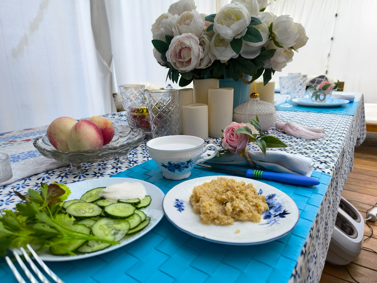 Завтрак обожравшейся и зажравшейся Похудеишны: огурец, половина столовой ложки сметаны, зелень с грядки, пшеничная каша. В чашке горячая вода.