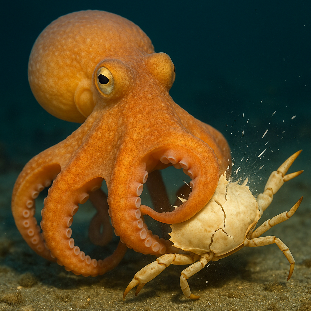 Краб двигался медленно. Вроде бы спокойно, будто ничего не происходит. А потом — будто кто-то стукнул по его спине молотком. Панцирь треснул. Внутри — всплеск. Конец. Я до сих пор не понимаю, как это возможно. Ведь тот, кто напал, — это вовсе не краб, не рыба и даже не что-то с когтями. Это осьминог. Без костей. Вообще без костей. Как желе с глазами. Но в то же время — один из самых быстрых, хитрых и точных хищников океана. Да, он выглядит так, будто его случайно уронили с верхней полки на дно. Просто скомканное существо, как мокрая салфетка. Но в этом мягком теле спрятан настоящий инструмент убийства — клюв. Настоящий, как у попугая. Он острый, прочный и надёжно прячется под слоями кожи, в самом центре тела. Туда, где у других животных был бы рот. Или пуговица. Этим клювом осьминог не просто кусает — он дробит. Вгрызается. Прокусывает панцири так, будто те сделаны из прессованного картона. Один щелчок — и краб уже не краб, а морской бутерброд. Без верхней корочки. Но самое странное