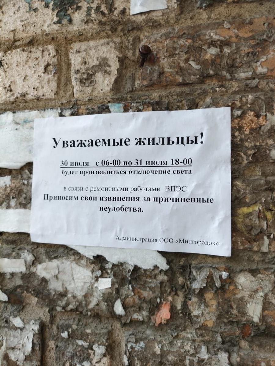 📍Владивосток. Помогите пожалуйста с оглаской. У нас на доме, ул.Адмирала Юмашева 8б, разместили объявление об отключении электроэнергии на ‼️1.5 суток‼️в такую жару‼️ Без кондиционеров и вентиляторов, водонагревателей и других способов нагреть воду, ведь горячая вода отсутствует. Мы уже молчим о том, что продукты могут испортиться за такое количество времени и в такую температуру. В доме живут пожилые люди, и маленькие дети. Мы не можем дозвониться ни в управляющую компанию, ни в администрацию ООО "Мингородок", ни в ВПЭС. Отключения проходят регулярно, видимо, связано с реконструкцией парка Минный Городок и строительством ЖК "Лиса Парк", но они были на 6-8-12 часов. Но никак не на 1.5 суток. Помогите с оглаской, может через Вас, нас услышат! 📲Сообщение от подписчика