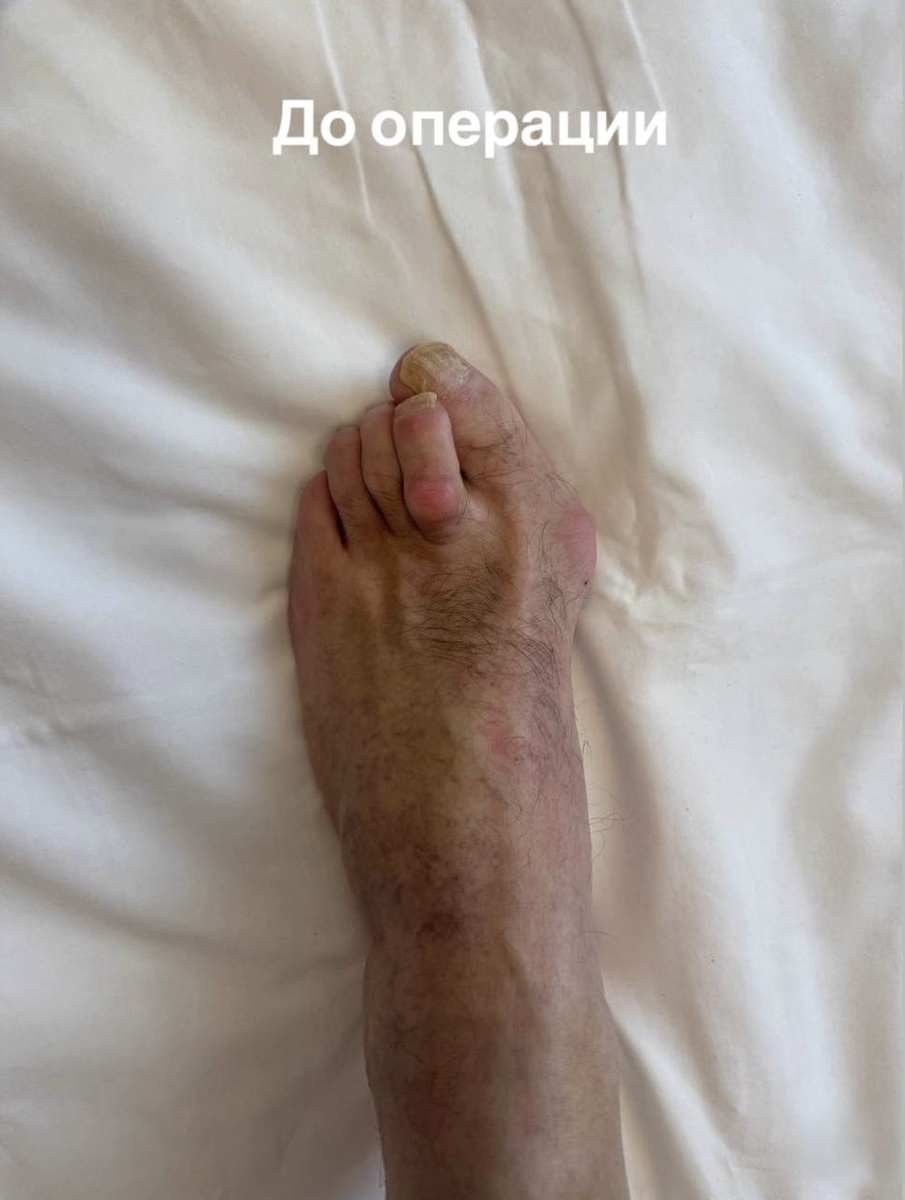 При первичном осмотре беспокоила боль в передней области стопы. Пациент функционально активен (огород, хозяйство и т.д.). Соответсвенно наша задача- максимальный функциональный результат. Основной причиной развития Hallux valgus обычно является недостаточность соединительной ткани, которая может проявляться поперечным плоскостопием, чрезмерной подвижностью суставов, повышенной растяжимостью связок, фасций и кожи и наследственной предрасположестью – как правило, у ближайших родственников больных также есть данная деформация. Визуально: выраженная деформация первого, 2, 3 и 4 пальцев стопы. Диагноз: Hallux valgus, молоточкообразная деформация 2-го пальца стопы, продольное и поперечное плоскостопие. В ходе операции проведена фиксация 1-го пальца в правильном положении , артродез(замыкание) второго межфаланогового сустава, укорочение 2, 3 и 4 пальцев. Артродез- оперативное вмешательство, в ходе которого сустав искусственно фиксируется в неподвижном состоянии, как правило, с целью уменьшен