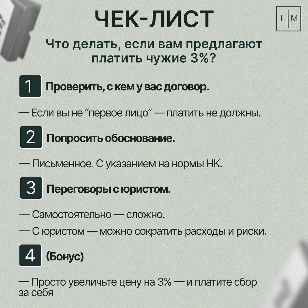 💫💫💫💫💫 💫 «Что делать: 3 сценария» ✔️ Если вам предлагают перевыставить 3% сбор — действуйте по сценарию: 😈Проверить, с кем у вас договор. — Если вы не “первое лицо” — платить не должны. 😈 Попросить обоснование. — Письменное. С указанием на нормы НК. 😈Переговоры с юристом. — Самостоятельно — сложно. — С юристом — можно сократить расходы и риски. 😈 (Бонус) — Просто увеличьте цену на 3% — и платите сбор за себя. Это проще, чем компенсировать всем подряд. А чтобы не потерять информацию, сохраните себе картинку с нашим чек-листом. Пригодится 🤗 #сериал и его последняя серия выйдут 1 августа. Давайте поддержим нас реакцией 🔥