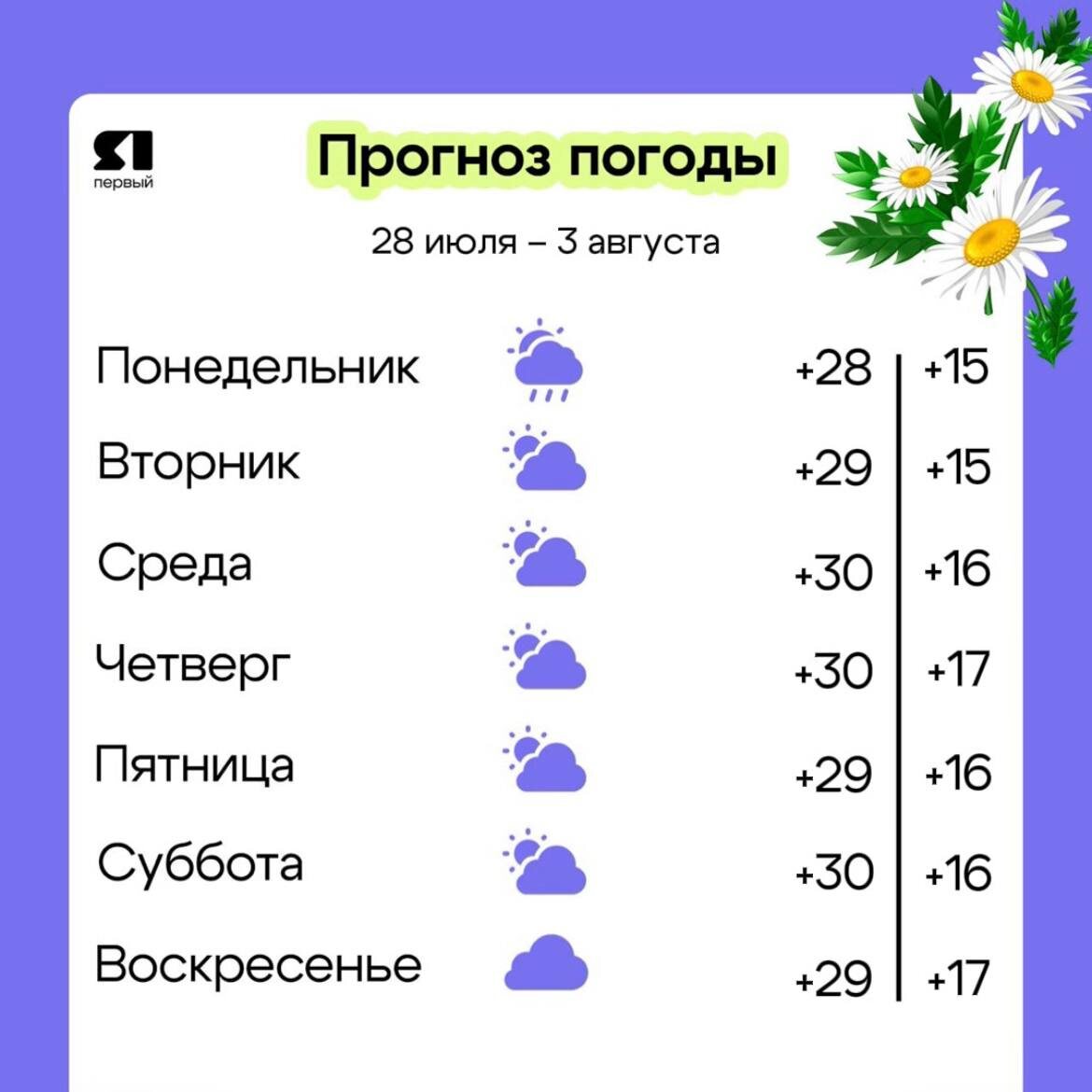 😎 А жара-то возвращается! Июль потихоньку сдает позиции, но изменения ожидаются пока только в календаре. В ближайшие дни воздух прогреется до +30. Так что, летняя погода порадует нас и в первые дни августа Смотрим прогноз на эту неделю⬆️ 💚 Подписаться | Прислать новость