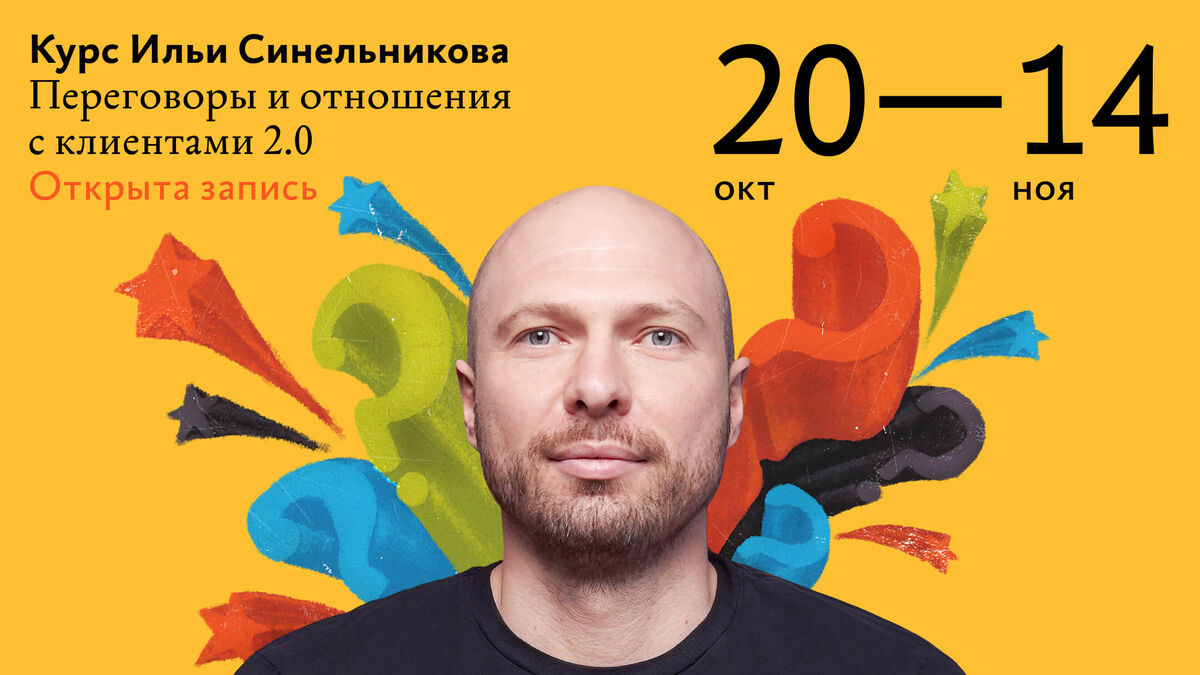 Открыта запись на курс Ильи Синельникова «Переговоры и отношения с клиентами 2.0». Курс длится четыре недели и пройдёт с 20 октября по 14 ноября в дистанционном формате. До 20 сентября стоимость ниже на 30%, позднее — участие станет дороже. Успейте записаться! Перерождение классического курса о том, как добиваться своего в любых переговорах. Задача курса — дать профессионалам базовые навыки переговоров и снять страх перед «непоколебимым» клиентом, а менеджерам — научиться отстаивать интересы без разрушительных последствий. На курсе рассматриваются универсальные приёмы устных и письменных переговоров. Подробно разбираются отношения с клиентом от первого обращения и понимания задачи до работы в проекте и профилактики ссоры. Илья Синельников ведёт разные версии курса с 2012 года. Практические упражнения всегда вызывали самый большой интерес, и в конце многим хотелось ещё, поэтому в обновлённой версии почти всё время с преподавателем посвящено практическим занятиям. Новые домашние задания
