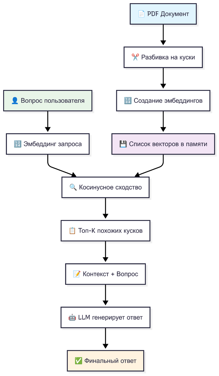 - Зачем это нужно: Это и есть семантический поиск в действии. Вместо поиска по совпадению слов, мы ищем векторы, которые «смотрят» в том же направлении, что и вектор вопроса. Это позволяет найти релевантные чанки, даже если в них нет ни одного слова из самого запроса.