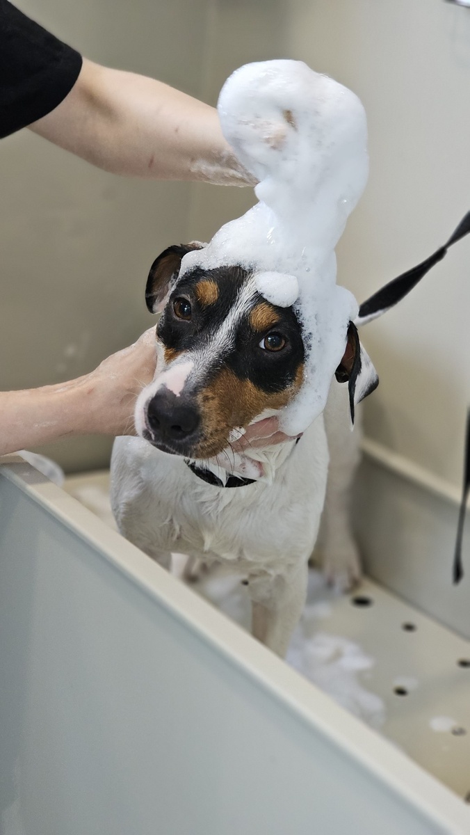 Начинаем день со спа для брутального красавчика с невероятным окрасом, джек-расселом Томми 💖