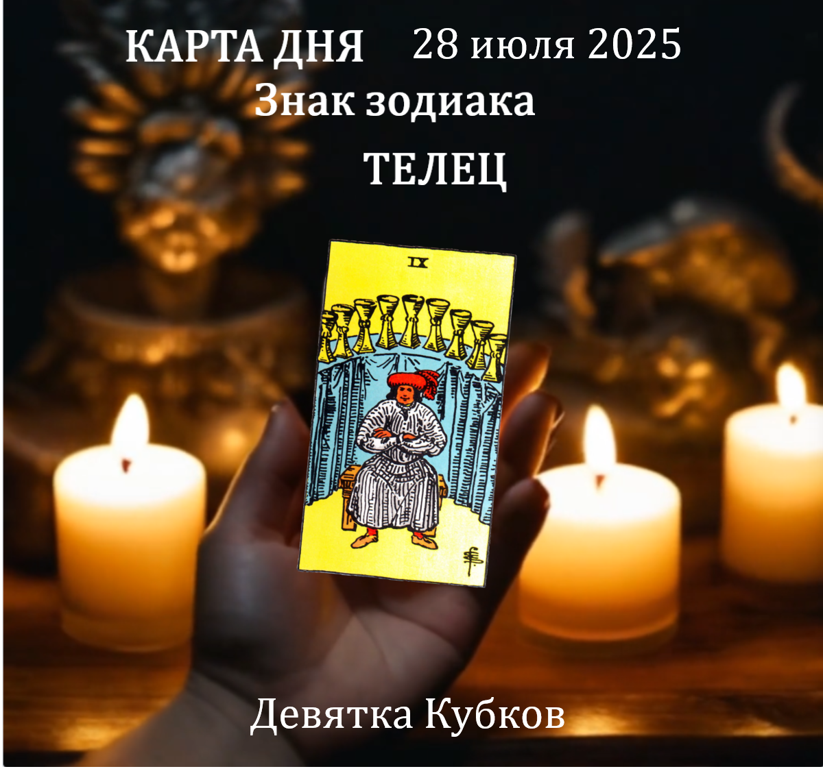 Аркан предсказывает проявление взаимной симпатии, которая может перерасти в длительные отношения или даже в создание семьи с заключением законного брака. Однако девятка Кубков предупреждает от чрезмерного зацикливания друг на друге, это может привести к проблемам. Решите между собой оставшиеся вопросы и ваши отношения станут гармоничными и принесут счастье и радость. Карта предвещает хороший день, наполненный уверенностью и стабильностью. Возможна денежная прибыль, равно как и трата на дорогую, но очень желанную покупку. Для работающих по найму карьерный и профессиональный рост, перспектива увеличения зарплаты. Хорошее самочувствие и здоровье, никаких особых проблем не ожидается, разве что простудные заболевания. Для тех кто болеет, аркан обещает скорое и полное выздоровление.