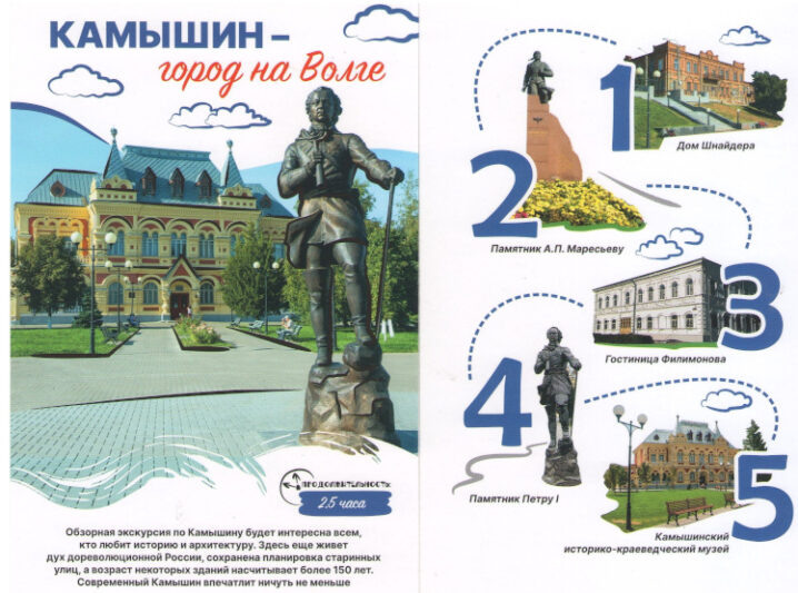 Этим летом в Камышин приглашают туристов. Для рекламы в интернете созданы рекламные коллажи, которые призваны привлечь внимание потенциальных гостей города на Волге. Для жителей Камышина мы публикуем очередной подобный коллаж. И традиционно задаёмся вопросами: «Камышин — туристический города? Что мы может ещё показать и предложить?». Итак, в рекламном буклете «КАМЫШИН — город на Волге» представлены: Дом Шнайдера (угол улиц Октябрьской и Набережной), памятник Герою Советского Союза А.П. Маресьеву (улица Некрасова), гостиница Филимонова (Центр патриотического воспитания имени А.П. Маресьева и художественная галерея на улице Советской), памятник Петру Первому и Камышинский историко-краеведческий музей. Продолжительность: 2.5 часа.