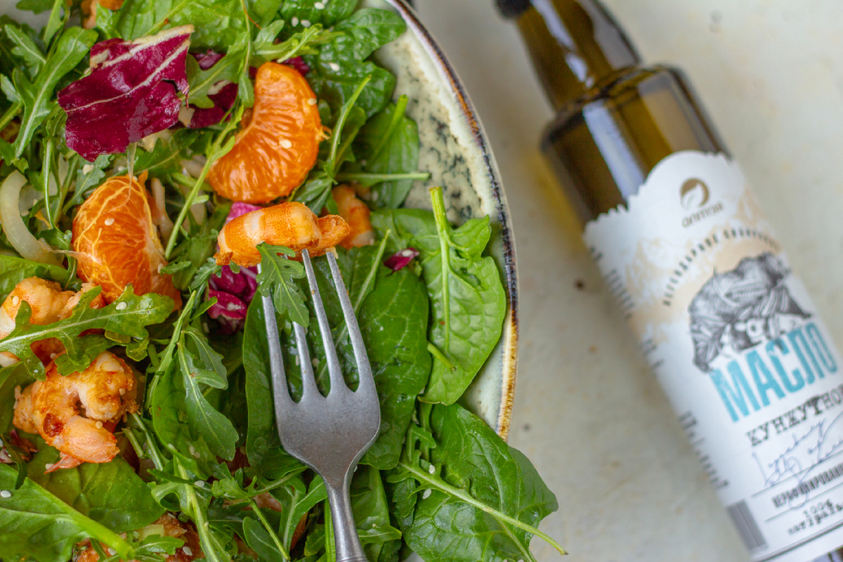 - Сложить в тарелку рукколу, шпинат, мандарины, креветки и лук. Добавить кунжут.