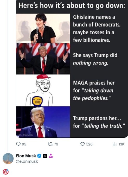 Musk says Trump PARDONS Ghislaine Convicted pedo trafficker 'did nothing wrong'?