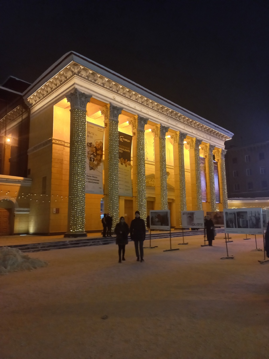 Как я неоднократно говорил в своих статьях, Новосибирск - это олицетворение слова "эклектика". Поэтому неудивительно, что прямо позади дореволюционного театра стоит современное 14-этажное офисное здание, которое занимает Сбер. Конечно же, какой-то выдающейся архитектурой тут и не пахнет, просто безликая стекляшка. К тому же, без новогодней иллюминации, с обычной подсветкой.