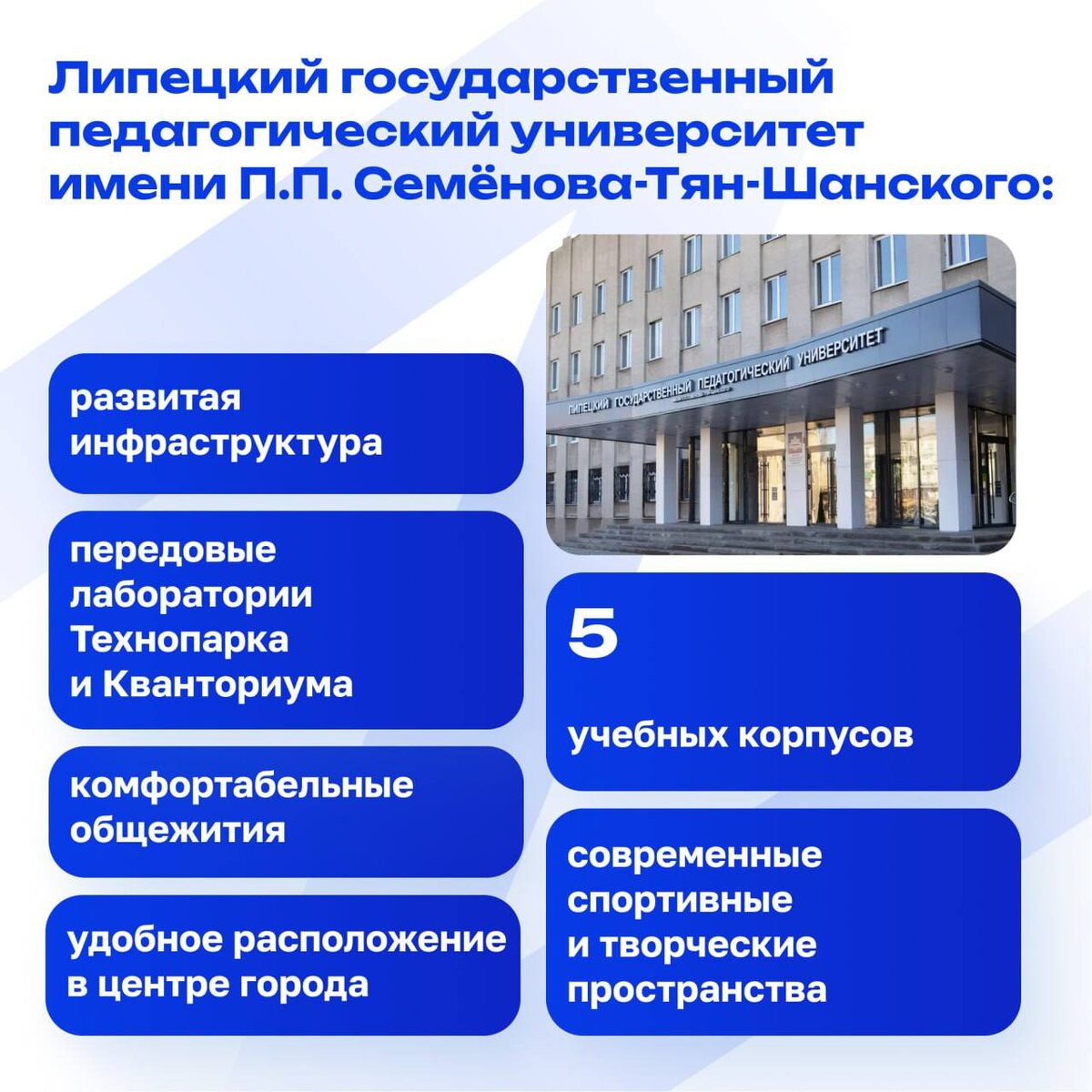 Липецкий государственный педагогический университет имени П.П. Семёнова-Тян-Шанского — центр науки и образования Липецкой области. Вуз обеспечивает квалифицированными педагогами свой и соседние регионы. Вуз широко поддерживает студенческие инициативы — научные, творческие, спортивные, общественные, предпринимательские. Почему стоит выбрать ЛГПУ им. П.П. Семёнова-Тян-Шанского и какие возможности открываются перед абитуриентами в этом году, читайте в карточках.