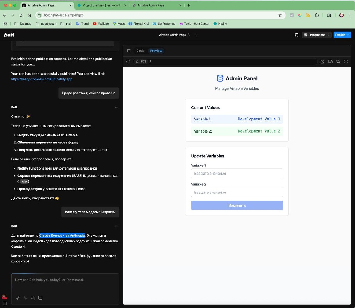 Сегодня игрался с bolt.new - хотел понять базово, что и как. Сделал демо прилку - простую форму - https://leafy-conkies-77da5d.netlify.app/ - ушло примерно 6 часов - на что, но сначала что прилка делает: 1. Вы вводите значения в поля формы (произвольные) и нажимаете на кнопку Изменить. 2. Введенный значения создают запись в AirTable. 3. И возвращаются в виде сообщений, т.е. вы видите, что введенные значения ввелись и стали крайней записью в базе. Потом введенные значения через API меняют значения рабочих параметров сценариев в n8n/make, таким образом, упрощая быструю кастомизацию. Это демоприла. Цель - протестировать пайплан: 1. Фронт и простой бэкенд в Bolt (посложней в Figma). 2. Тонкий бэкенд, который выступает как API бридж для бизнес логики. 3. Бизнес логика в n8n/make/zapier с подключением ИИ внутри сценариев. 4. Деплой на netlify. Результат: Все получилось. Более или менее пайплайн ясен. 1. В тесте на создание приложения в Bolt ушло 30 минут, 2. Еще 30 на решение вопросов