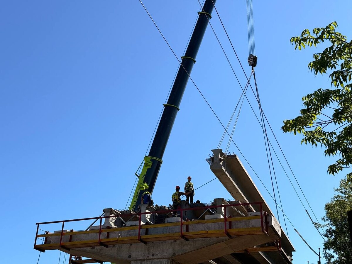 Строители в Белогорске завершают возведение еще одного пролета путепровода по ул. Базарная. Его строительство продолжается с опережением графика. — Из 16 опор уже возведены 10, — рассказал начальник участка Александр Борисевич. — Продолжаем забивать сваи, монтировать балки. 2 пролета смонтированы, на них уложены 12 балок. Накануне доставлены еще 6 балок, весом 33 тонны каждая и длиной по 24 метра. Сегодня уже смонтирована шестая. На данном этапе задействовано три крана: один грузоподъемностью 50 тонн, другой — 80 тонн, и тот, который находится непосредственно на монтаже, 150 тонн. Балки изготавливаются на нашем же заводе, в Тюмени. Одновременно ведутся работы по устройству локальных очистных сооружений. Ранее сообщалось, новый путепровод Белогорска — это часть масштабной программы по строительству переходов через Транссиб, поддержанной Президентом Владимиром Путиным. Работы идут в рамках нацпроекта «Инфраструктура для жизни». Проект включает две полосы движения и метровую полосу безо