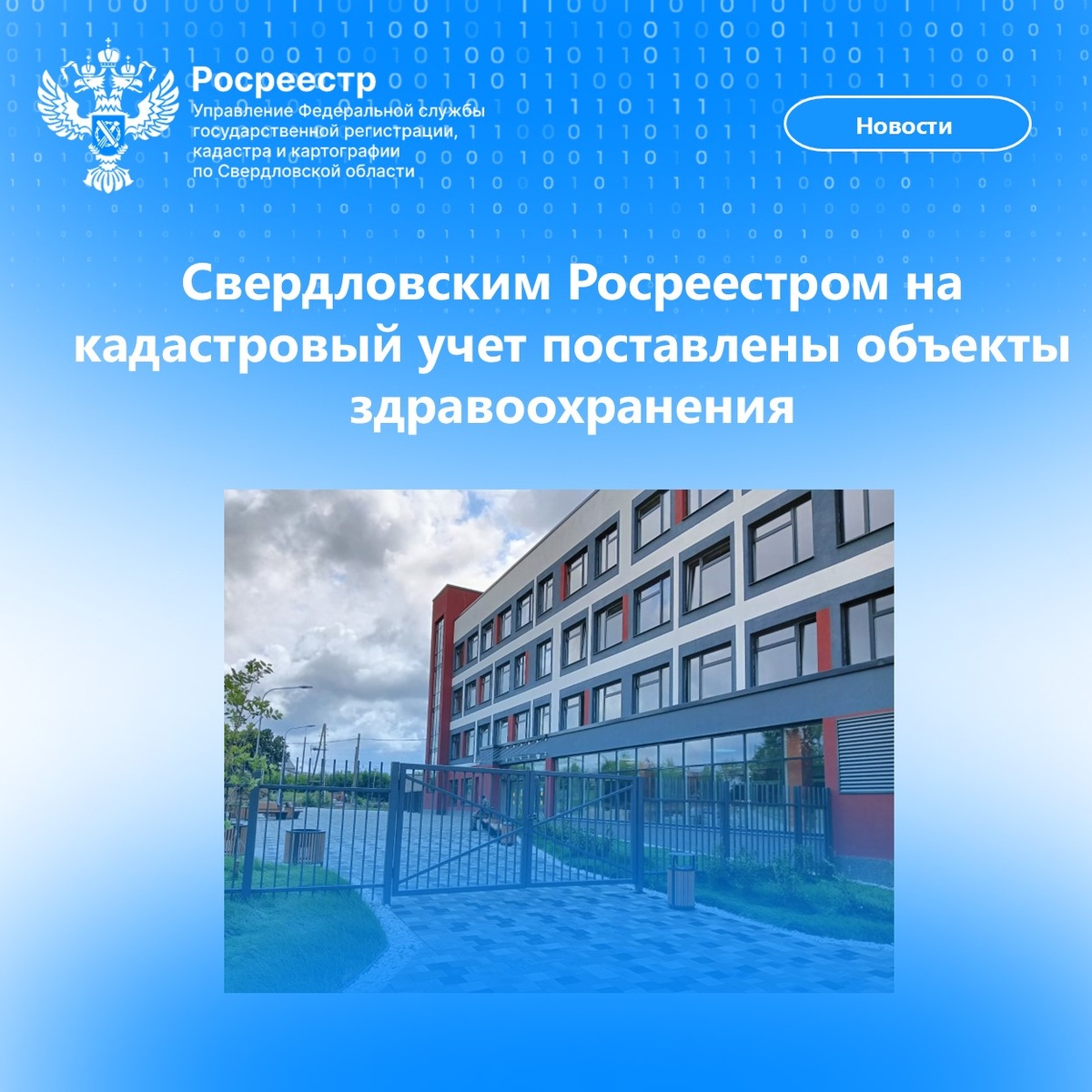 на государственный кадастровый учет в районе Уралмаш города Екатеринбурга по улице 40-летия Октября, строение 5. Поликлиника будет рассчитана на обслуживание 25 тыс. человек прикрепленного населения и 700 посещений в смену. Общая площадь поликлиники составляет 13672.2 кв.м. Новое здание состоит из педиатрического отделения, консультативного отделения, отделения профилактической помощи, отделения неотложной помощи, отделения восстановительного лечения, отделения лучевой диагностики, отделения функциональной диагностики, дневного стационара на 22 койки и конференц-зала на 200 посадочных мест для персонала. А в Артёмовском городском округе Свердловской области поставлено на кадастровый учет здание поликлиники №1 государственного автономного учреждения здравоохранения Свердловской области "Артемовская центральная районная больница" площадью: 8164.8 кв.м., расположенное по адресу: город Артемовский, улица Энергетиков, здани