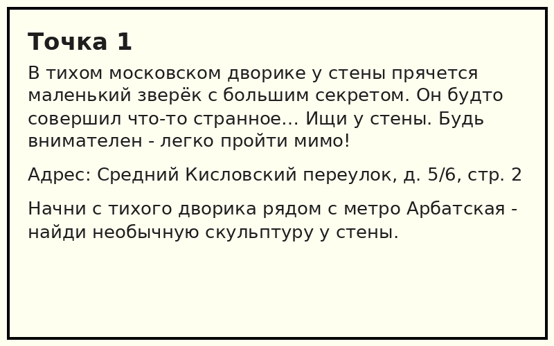 Вы просто гуляете, участвуете в разных активностях, решаете загадки, ищете объекты — и делаете фото. Много фото. Это маршрут по 12 необычным точкам центра Москвы. Здесь и белка с пистолетом (не шутка), и самовар, и воздушный шар, и целый автобус, заросший цветами. Все локации — бесплатные. Это фестивальные павильоны и городские арт-объекты. Вы просто гуляете, участвуете в разных активностях, решаете загадки, ищете объекты — и делаете фото. Много фото. Весь маршрут занимает от 2,5 до 3 часов, если идти в хорошем темпе. Как ориентироваться? ✅ Вариант 1 — онлайн-маршрут (с использованием онлайн карт). ✅ Вариант 2 — офлайн-карточки с загадками. Можно распечатать или сохранить в телефоне: карточки можно скачать ЗДЕСЬ. Перед стартом объясните ребёнку: Цель: найти в
