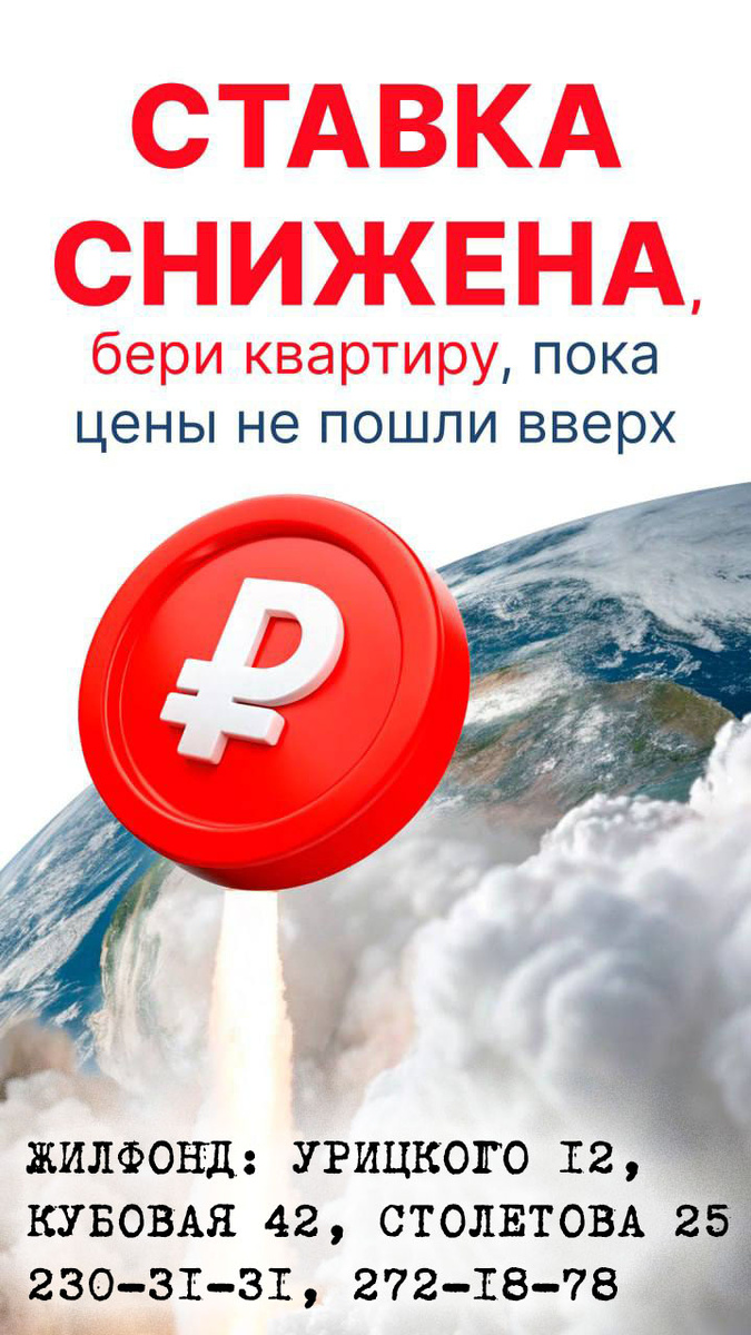 ⚡️ ЦБ РФ снова снизил ключевую ставку — теперь до 18% (-2 п.п.). Это первое большое смягчение, и банки могут активнее снижать ипотечные ставки. И, как следствие, цены на недвижимость пойдут вверх 👆🏻 Следующее заседание — 12 сентября. НАШИ КОНТАКТЫ: АДРЕС г. Новосибирск, ЖИЛФОНД на ул. Урицкого, д.12, ул. Кубовая, д.42, Столетова 25 ТЕЛЕФОНЫ 230-31-31, 272-18-78 🔔 Подписывайтесь на наши соцсети, чтобы быть в курсе всех новостей, акций и получать полезные советы по недвижимости 👉 ДЗЕН https://dzen.ru/jilfondru