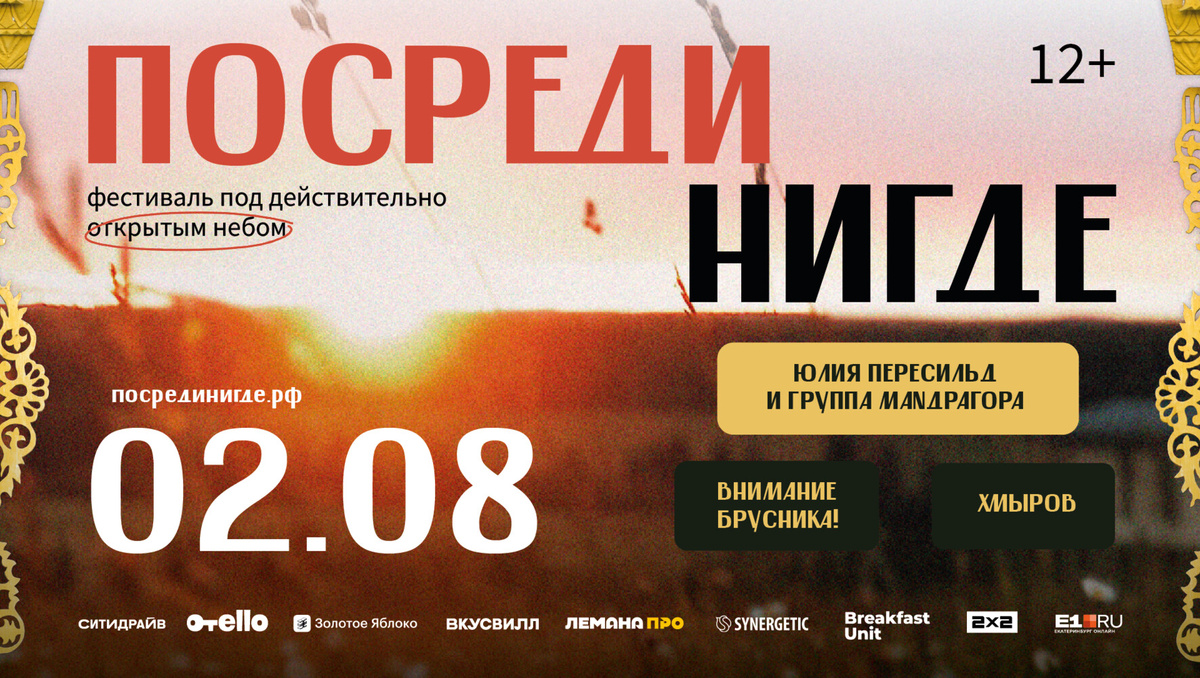 2 августа в деревне Малый Турыш в Свердловской области вновь пройдет фестиваль «Посреди Нигде» — яркий праздник, который стал большим, чем просто культурное событие. В этом году программа фестиваля расширится: гостей ждут концерты, мастер-классы, фермерская еда, а также участие в создании арт-объекта со смыслом — лабиринта из соломы, который станет символом единения и соучастия. Проект реализуется при поддержке партнеров и благодаря краудфандинговой кампании на Planeta.ru. В программе фестиваля в этом году — поездка на специальном поезде из Екатеринбурга, выступление актрисы Юлии Пересильд с музыкальной группой МАNДРАГОРА, а также мастер-классы, арт-пространства, фотозоны, деревенский ресторан под открытым небом и прогулки с коровами. К событию присоединились партнеры: Ситидрайв, ВкусВилл, Золотое Яблоко, Отелло, Леман ПРО, Synergetic. Благодаря их поддержке на территории проведения фестиваля появятся интерактивные точки, активности для гостей и инфраструктура для комфортного пребывани