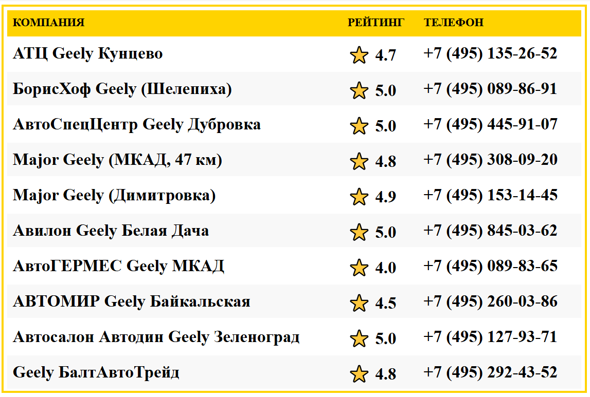 При выборе Geely дилера в Москве лучше всего ориентироваться на АвтоСпецЦентр Дубровка и БорисХоф Geely — они лидеры по отзывам, предложениям и комфорту. АТЦ Кунцево хорош для тех, кто ценит скорость и понятные условия. Major (МКАД 47 км) предлагает выгодные кредиты и подарки, но находится дальше от центра. Избегайте дилеров с низким рейтингом: Major Димитровка и Авилон Белая Дача имеют серьезные жалобы. Остальные дилеры удобны по расположению и предлагают приемлемый уровень сервиса.