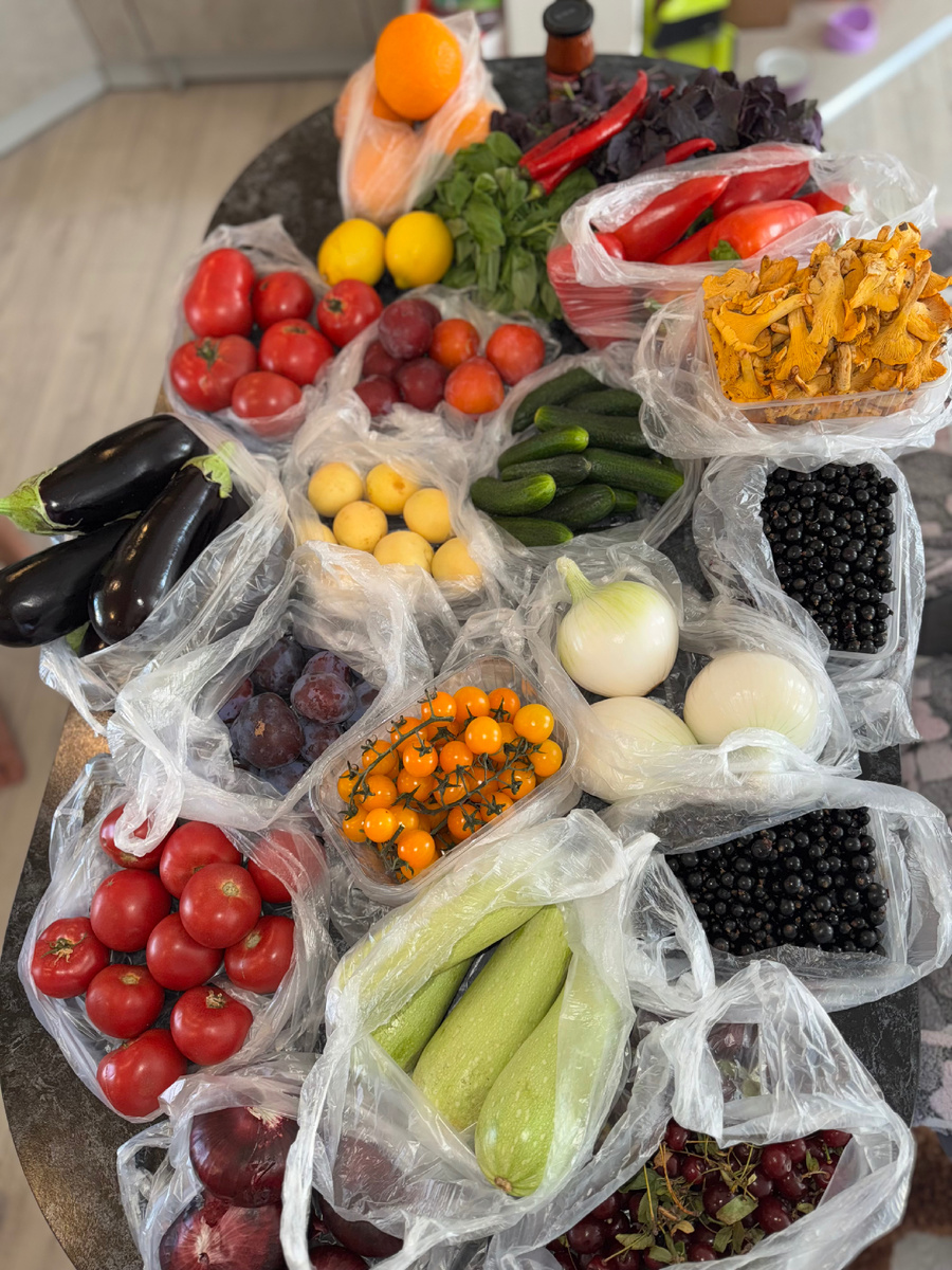 Ну вот друзья… поход на рынок нам обошёлся в 13 тыс.₽. То что на столе на 9 тыс. Просто овощи и фрукты как-то дорого, да? Хотели сэкономить поездкой на оптовый рынок, в итоге не сориентировались там (витрины нет, ничего непонятно, овощи вялые. Возможно не знаем где брать 🤷♀️) и уехали на обычный рынок. По факту дороже чем в супермаркете, но красивее всё выглядит. Из цен которые я запомнила: базилик-1130₽, помидоры-500₽, черная смородина- 1000₽ за кг.