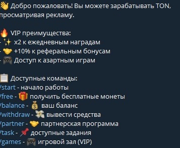 Дружище, представляю простой и приятный способ пополнить кошелёк, да ещё и расслабиться между делом! 🎯 ▌ Что тут вообще надо делать? 1. Регистрация: Пройти регистрацию у дружелюбного бота и получать криптовалюту TON, отдыхая дома перед телеком. Легко и непринуждённо! 2. Партнёры: Захотел повысить заработок? Просто делись своей рефссылкой среди друзей и знакомых. Получаешь бонус — 10% от доходов тех, кого пригласишь. Это совсем несложно и весьма выгодно! 3. Зарабатываем на мелочёвке: Простые задания вроде просмотров рекламы и лёгких кликеров. Ничуть не сложнее привычных буксовских заданий, зато весело и продуктивно! 4. VIP-аккаунт: Платишь скромный баксенёк ($1), примерно столько же, сколько хорошая кружка латте, и твой профит мгновенно умножается вдвое! Плюс открываются эксклюзивные игры, где можно снова заработать дополнительные средства. ▌ Чем круто именно это предложение? ✔️ Подходит абсолютно каждому, никаких сложностей — регистрируйся и работай спокойно! ✔️ Реферальная система по