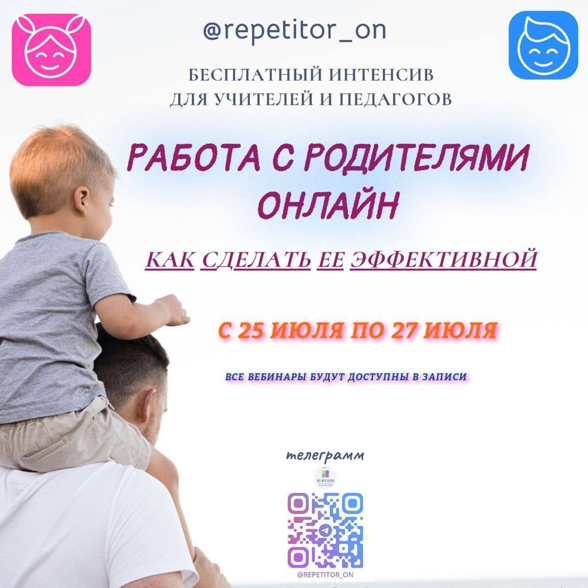 🙂🙂🙂🙂🙂🙂🙂🙂🙂🙂 🙂🙂🙂🙂🙂🙂🙂🙂 ▶️РАБОТА С РОДИТЕЛЯМИ ОНЛАЙН завершился! Огромное спасибо нашим экспертам и слушателям за активное участие 🔴Профессиональные педагоги и репетиторы поделились своим опытом успешной работы с родителями онлайн, методиками эффективного сотрудничества ❗️У вас есть возможность посмотреть вебинары в записи Как посмотреть записи интенсива? ➖➖➖➖➖➖➖➖➖➖➖ 1. Перейдите в нашего бота и нажмите // start @intensiv_parents_bot 2. Подпишитесь на ВСЕХ экспертов и на канал интенсива (бот сам подскажет) 3. Сразу после этого получите ссылку на закрытый канал, где проходил интенсив До встречи на следующем интенсиве! 🙂