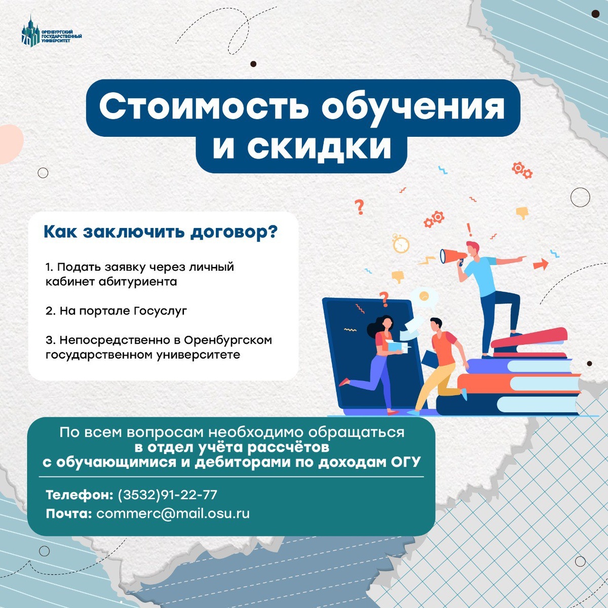 Образование, которое доступно 😎 Хочешь платить меньше за обучение в ОГУ? Это возможно! Обучающиеся очной формы обучения могут получить следующие преференции: 🔻 Социальные скидки 🔻 Скидки по результатам вступительных испытаний и индивидуальных достижений (для поступающих на направление подготовки, по которым осуществляется приём на бюджетную основу обучения в текущем году и имеющих сумму баллов по результатам ЕГЭ от 210 и выше) Полный перечень оснований для скидок и порядок их предоставления ты найдёшь тут. 📲Остались вопросы? Звони - специалисты ответят на все вопросы: (3532) 91-22-77 #ОГУ #в_ОГУ #OSU #АбитуриентОГУ2025