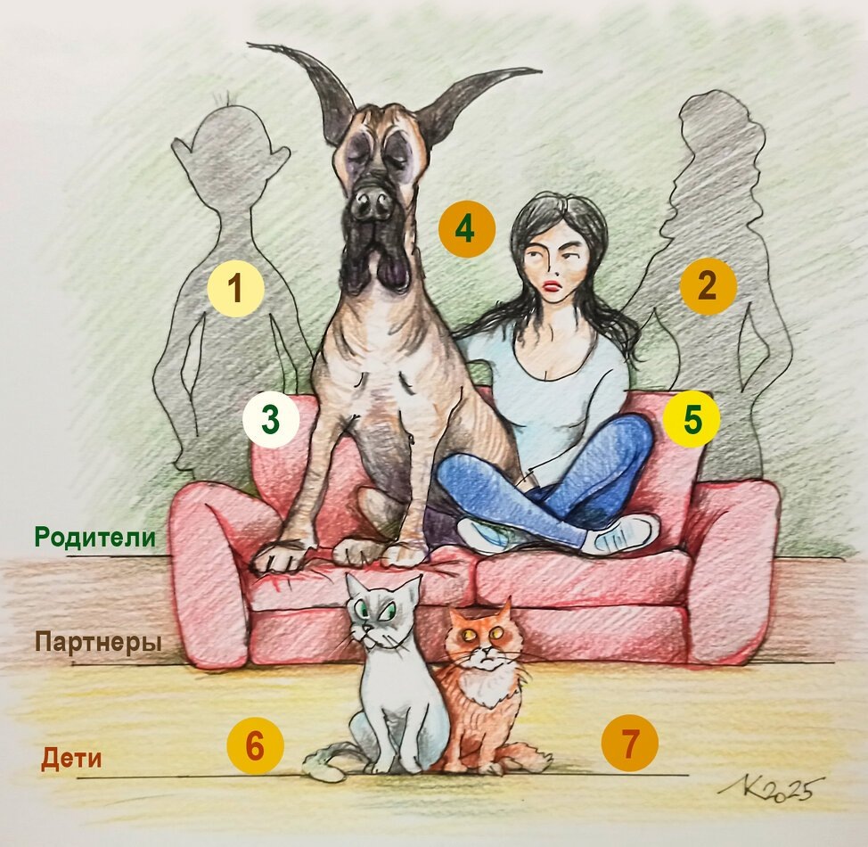 Для этого надо узнать топонимику (конфигурацию в Поле) семьи Алины здесь и сейчас – то есть, расположение её членов друг относительно друга. Андрей (это его запрос, значит, должно быть и его виденье) бессознательно ощущает так, как это изображено на картинке. Дог – рядом с Алиной, справа от неё; впереди них – кошачья пара: кот слева, кошка справа.