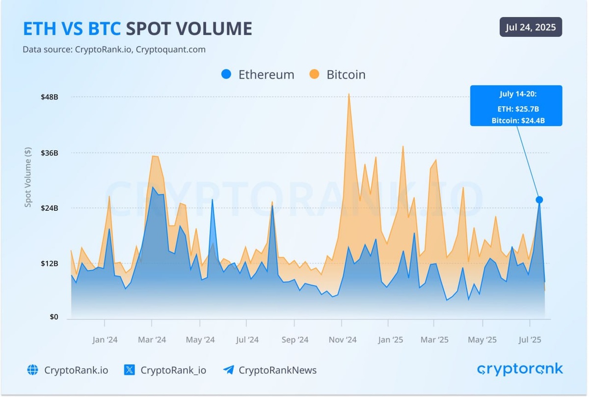 ☝️ Недельный объем торгов #ETH Ethereum превысил объем торгов #BTC Bitcoin Биткоина