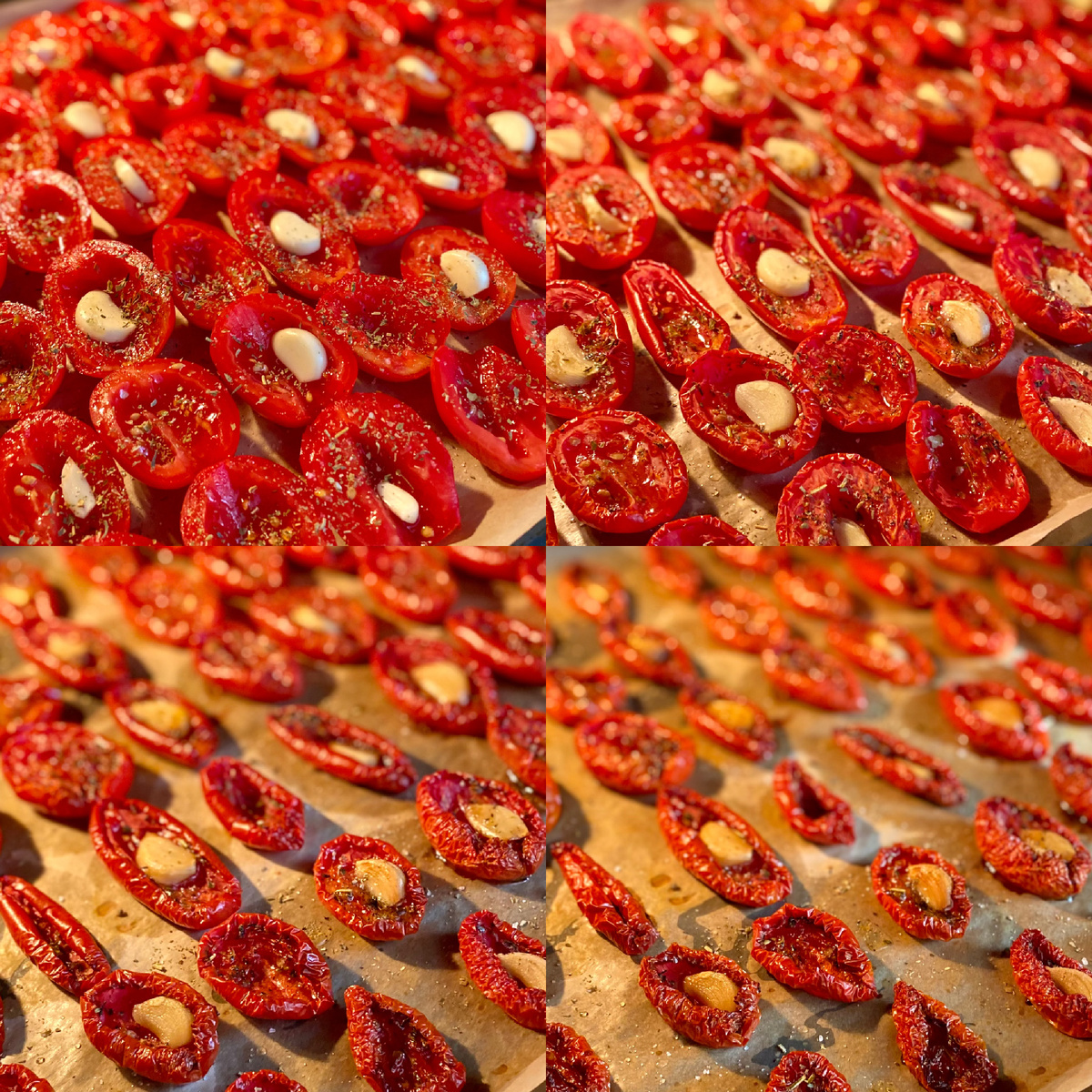 Лето время заготовок 🫙и пришло время действовать, девочки 😁 У меня есть очень классный рецепт вяленых томатов 🍅 делюсь им с вами! Ингредиенты: Приготовление: Духовку разогреть до t 100°C, режим конвекция. Томаты помыть, промокнуть бумажным полотенцем, разрезать пополам и удалить серединку. Томаты выложить на противень застеленный пекарской бумагой. Чеснок почистить и разрезать каждый зубчик на две части, положить в середину помидорок (не на все половинки). В миске смешать соль и сахар, посыпать томаты (уйдёт не вся смесь). Посыпать итальянскими травами и полить маслом. Отправить в разогретую духовку на 5-6 часов. Периодически открывать духовку (примерно раз в час), чтобы выпустить влагу. Время приготовления зависит от духовки, используете режим конвекции или только верхний-нижний нагрев (в этом случае время может увеличиться и до 8 часов). Готовые томаты переложить в баночки (стерилизованные) и аккуратно залить горячим растительным маслом (не кипящим! сильно масло не нагревать, пр