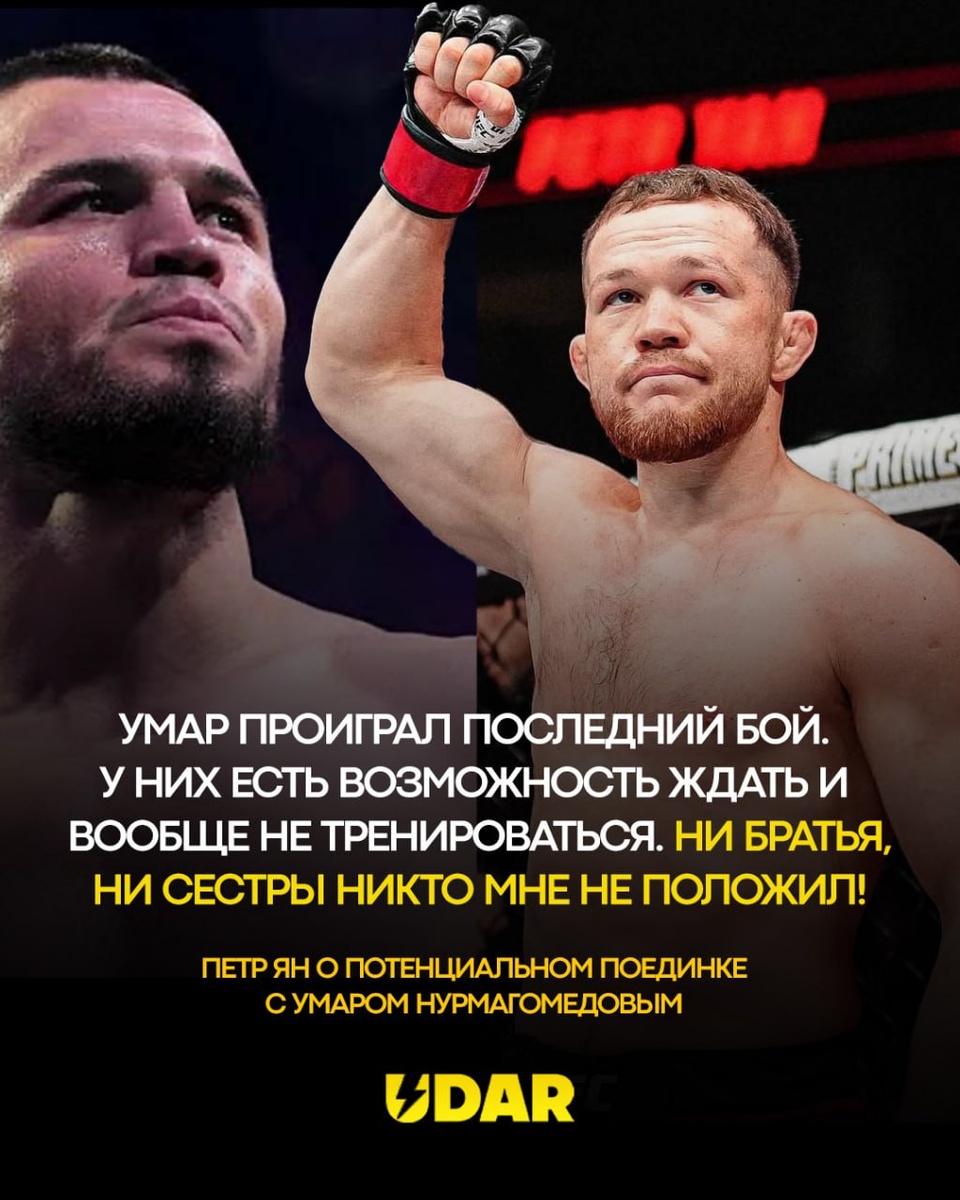 ⚡️Петр Ян намекнул, что Умар Нурмагомедов живет в "золотых условиях". После боя звезда российского ММА Петр Ян отреагировал на вопрос про Умара Нурмагомедова. "Умар проиграл свой крайний поединок. Он еще не провел ни одного боя. У них есть возможность ждать и вообще не тренироваться. Можно по году или полгода. Мне нужно действовать, работать. Ни братья, ни сестры, никто мне не положил, не дал ничего!" - сказал Петр Ян. Согласны с Петром? ❤️ - Да, конечно. 👍 - У каждого свои братья и сестры.