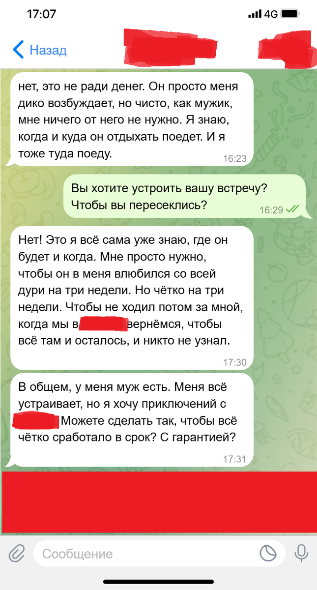 Не всегда клиент хочет длительных отношений от объектов своих желаний. И это даже хорошо, если есть чёткое понимание своих целей. Хорошо для клиента – чтобы не платить потом за снятие заказанного приворота. И хорошо для меня – я сразу понимаю, что человеку нужно, и предлагаю лучшее решение!